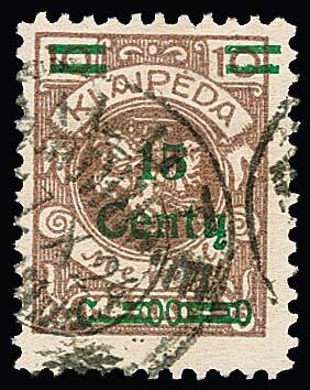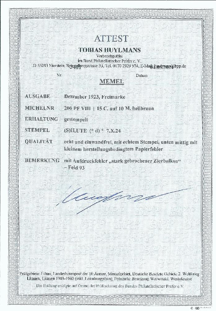 | Zusatzinformationen und Suchstichworte: | Rauhut & Kruschel - 218. Auktion 10. Juni 2023 Los 2550 Memel 15 C. a. 10 Mk. sauber gestempelt "Silute", mit dem Aufdruckfehler von Feld 93, "stark gebrochener Zierbalken". Die Marke ist schon als gestempelte Normalmarke selten, mit dem Aufdruckfehler bisher gestempelt im Michel unbekannt Ausruf 900,00 EUR |