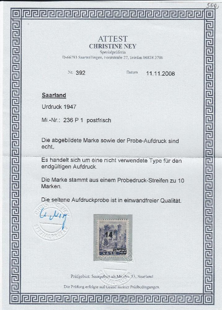 | Prüfgebiet: | Saarland (ab Mi-Nr. 206) |