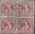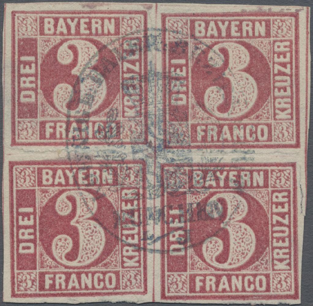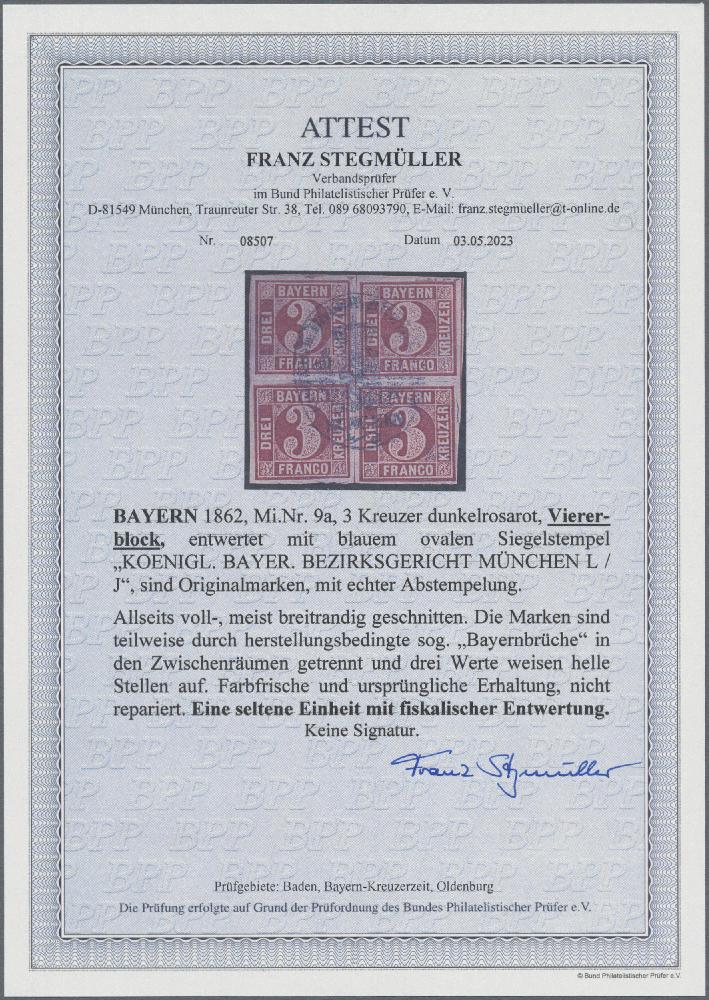 | Zusatzinformationen und Suchstichworte: | Christoph Gärtner 56. Auktion 12. - 16. Juni 2023 Los 4515 D Altdeutschland Bayern 1862, 3 Kr dunkelrosarot im Viererblock, entwertet mit blauem ovalen Siegelstempel "KOENIGL. BAYER. BEZIRKSGERICHT MÜNCHEN L / J", sind Originalmarken mit echter Abstempelung. Allseits voll- meist breitrandig geschnitten. Die Marken sind teilweise durch herstellungsbedingte sog. "Bayernbrüche" in den Zwischenräumen getrennt und drei Werte weisen helle Stellen auf. Farbfrische und ursprüngliche Erhaltung, nicht repariert. Eine seltene Einheit mit fiskalischer Entwertung Zuschlag 200,00 EUR |