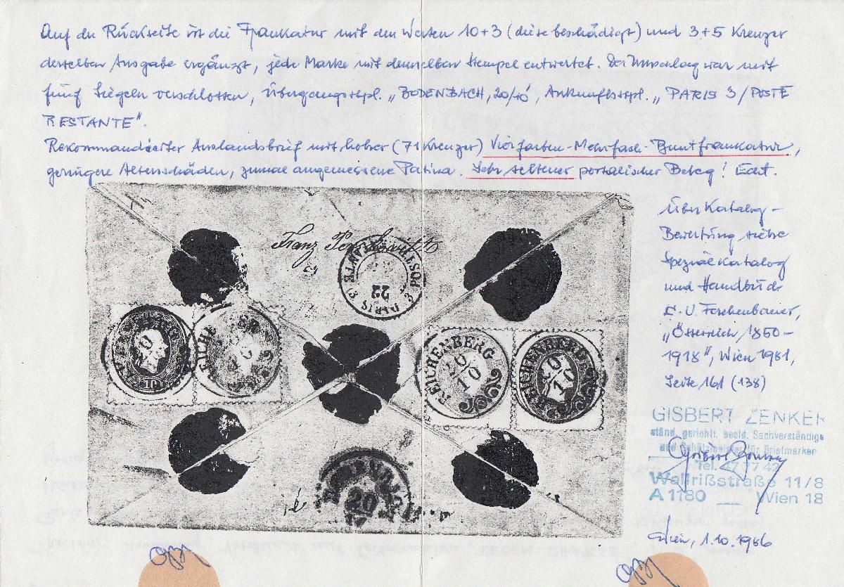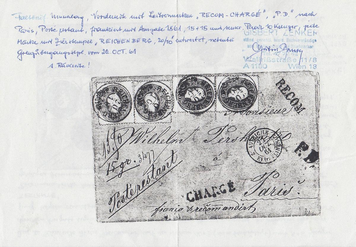 | Zusatzinformationen und Suchstichworte: | 71 Kreuzer Vierfarbenfrankatur Reichenberg nach Paris, recommandirt, poste restante |
