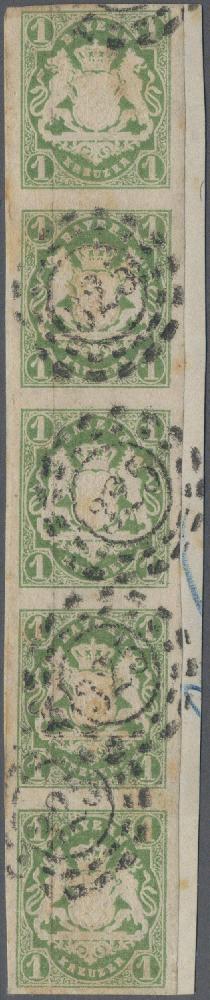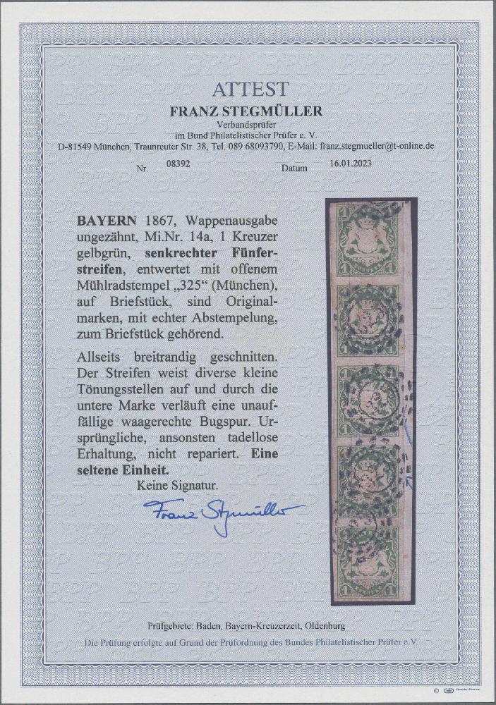 | Zusatzinformationen und Suchstichworte: | Christoph Gärtner 56. Auktion 12. - 16. Juni 2023 Los 4516 D Altdeutschland Bayern 1867 'Wappen' 1 Kr. gelbgrün im senkr. FÜNFERSTREIFEN auf Briefstück, sauber und übergehend entwertet mit offenem Mühlradstempel "325" von München, allseits breitrandig, diverse kleine Tönungsstellen und unauffällige, waag. Bugspur durch die untere Marke, sonst in guter Erhaltung. Eine seltene Einheit! Zuschlag 210,00 EUR |