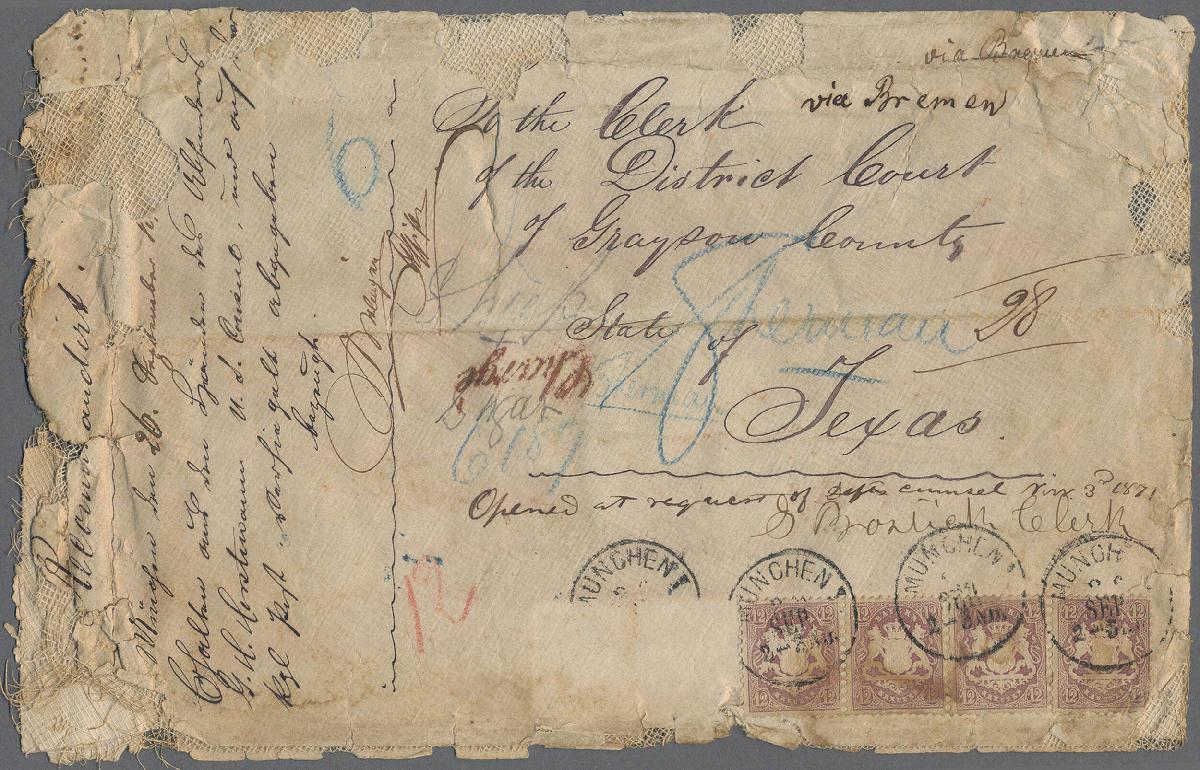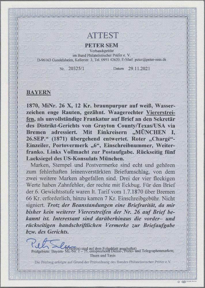 | Zusatzinformationen und Suchstichworte: | Christoph Gärtner 56. Auktion 12. - 16. Juni 2023 Los 4531 D Altdeutschland Bayern 1870, 12 Kreuzer mit Wasserzeichen enge Rauten als waagerechter VIERERSTREIFEN auf Charge-Brief von München nach Sherman in Grayson County im Bundesstaat Texas in den USA. Drei der vier fleckigen Werte haben Zahnfehler, der rechte einen Eckbug. Der Leinenverstärkte Umschlag im Format 235 x 150 mm zeigt vor allem an den Rändern Spuren einer offensichtlich sehr rauen Beförderung, und zwei ursprünglich zum Brief gehörende Marken sind abgefallen. Der am 26. September 1871 vom Münchener US-Konsulat aufgegebene und an den Sekretär des Distrikt-Gerichts von Grayson County gerichtete Brief trägt zudem vorder- und rückseitig diverse handschriftliche Vermerke zur Briefaufgabe bzw. des Gerichtes. Dieser Beleg ist bislang der einzig bekannte mit einem Viererstreifen der MiNr. 26 auf Brief (siehe Fotoattest Sem BPP). Das UNIKAT wurde von Einlieferer im Jahr 2021 entdeckt - und somit ziemlich genau 150 Jahre nach seiner Verwendung. Trotz der diversen Einschränkungen ist der Brief als sensationelle Neuentdeckung im Bereich der klassischen Postgeschichte anzusehen. (M) Ausruf 6.000,00 EUR |