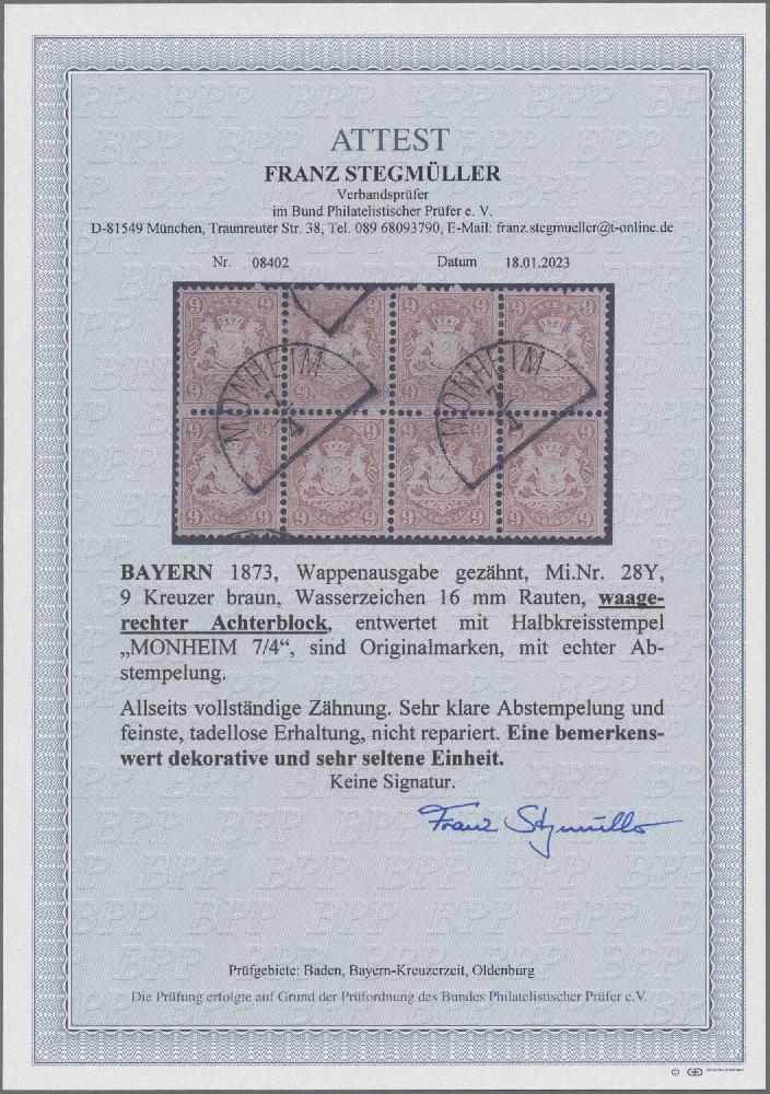 | Zusatzinformationen und Suchstichworte: | Christoph Gärtner 56. Auktion 12. - 16. Juni 2023 Los 4534 D Altdeutschland Bayern 1873 'Wappen' 9 Kr. braun im waagerechten ACHTERBLOCK, Wz. weite Rauten, sauber entwertet mit Halbkreisstempel "MONHEIM 7/4", in sehr guter, tadelloser und frischer Erhaltung. "Eine bemerkenswert dekorative und sehr seltene Einheit. (Zitat aus dem Attest F. Stegmüller BPP, 2023) (Mi. (für zwei 4er-Blöcke) min. 1500,- €) Zuschlag 3.200,00 EUR |