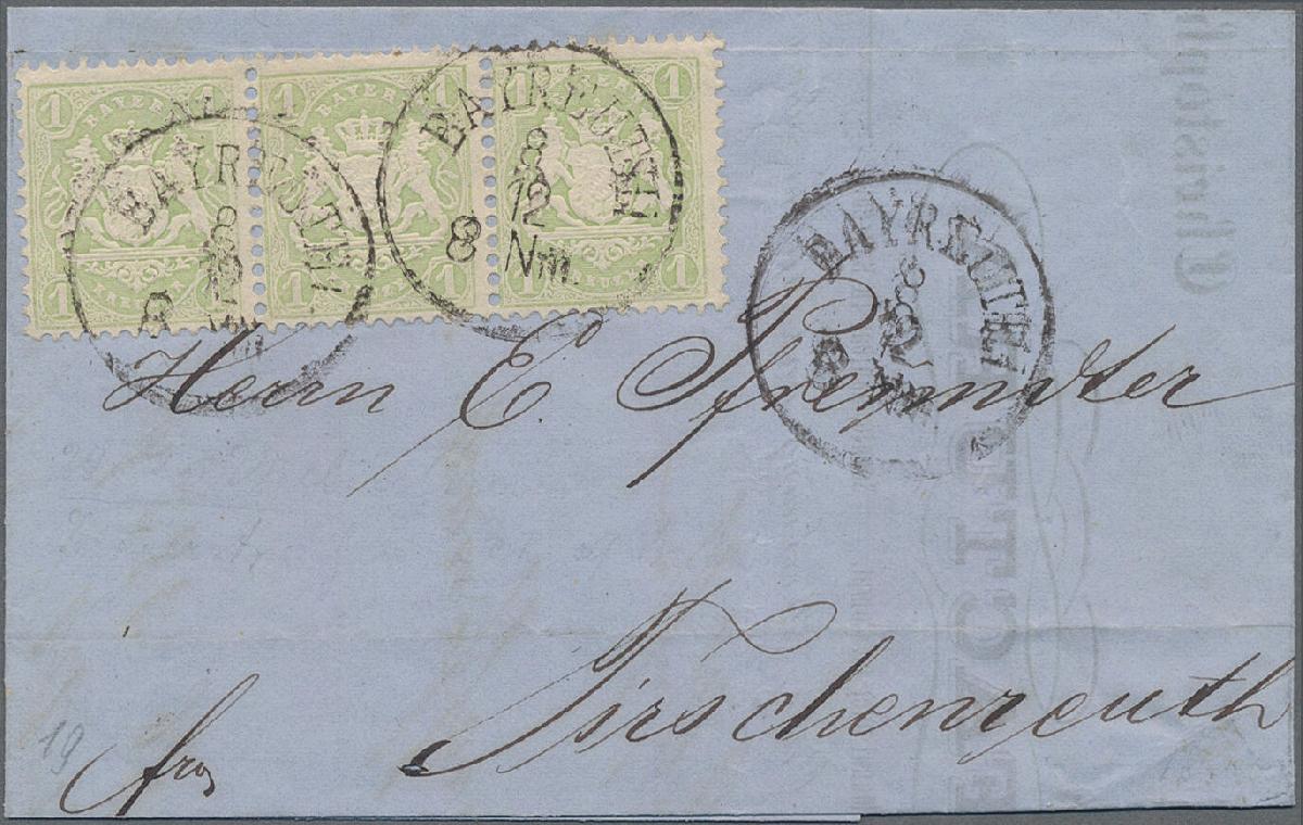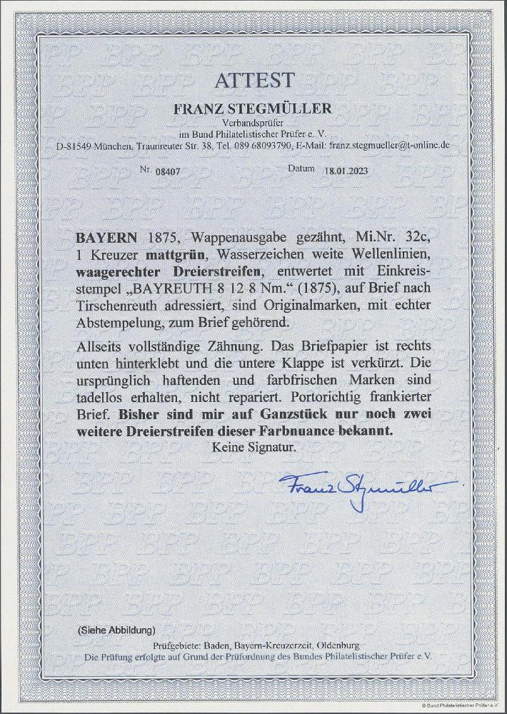 | Zusatzinformationen und Suchstichworte: | Christoph Gärtner 56. Auktion 12. - 16. Juni 2023 Los 4537 D Altdeutschland Bayern 1875 'Wappen' 1 Kr. mattgrün im waag. DREIERSTREIFEN, verwendet auf kleinem Faltbrief von Bayreuth nach Tirschenreuth, sauber und übergehend entwertet mit Einkreisstempel "BAYREUTH 8/12 8 Nm." (1875), in frischer und tadelloser Erhaltung. "Bisher sind mir auf Ganzstück nur noch zwei weitere Dreierstreifen dieser Farbnuance bekannt." (Zitat aus dem Attest F. Stegmüller BPP, 2023) Zuschlag 6.600,00 EUR |