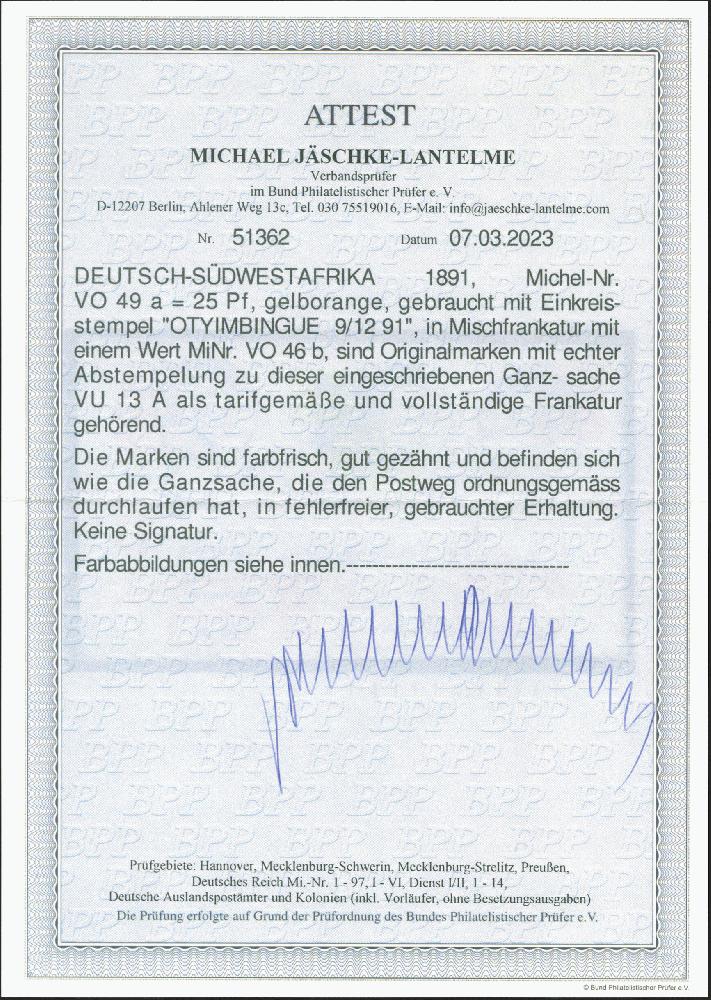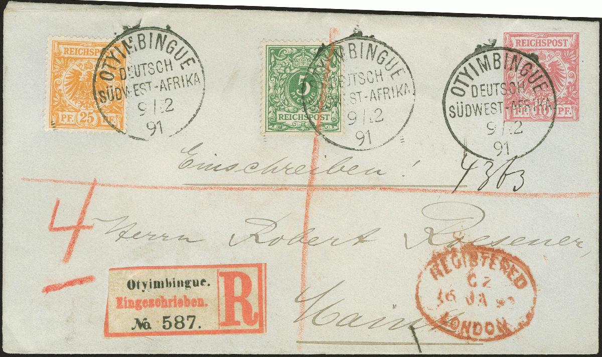| Zusatzinformationen und Suchstichworte: | Heinrich Köhler - IBRA Sonderauktion - Erivan: Deutschland ab 1872 27. Mai 2023 Los 91 Deutsche Kolonien Südwestafrika 25 Pfennig gelborange und 5 Pfennig gelblichgrün, beide farbfrisch und gut gezähnt, als Zufrankatur auf Ganzsachenumschlag 10 Pfennig, mit jeweils sauber aufgesetztem Stempel "OTYIMBINGUE 9/2 91", portogerecht als R-Brief nach Mainz mit vorderseitigem roten "REGISTERED LONDON" und rückseitigem Ausgabestempel. Tadellos. Fotoattest Jäschke-L. BPP (2023) Zuschlag 1.200,00 EUR |