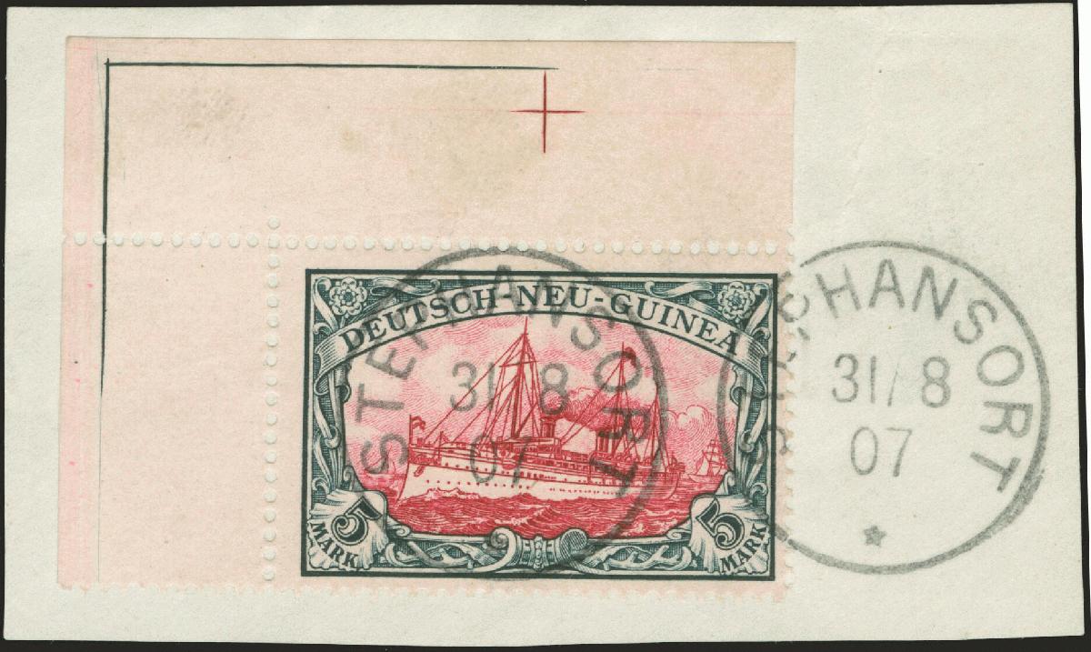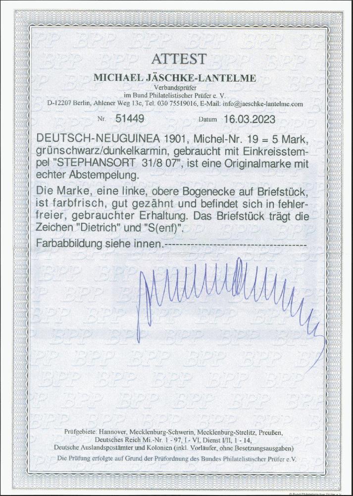 | Zusatzinformationen und Suchstichworte: | Heinrich Köhler - IBRA Sonderauktion - Erivan: Deutschland ab 1872 27. Mai 2023 Los 78 Deutsche Kolonien Neuguinea 1901, 5 Mark, linke obere Bogenecke, farbfrisch und tadellos gezähnt, mit glasklar aufgesetztem Stempel "STEFANSORT 31/8 07" auf Briefstück, tadellos. Signiert Dietrich und Senf, Fotoattest Jäschke-L. BPP (2023) Zuschlag 360,00 EUR |