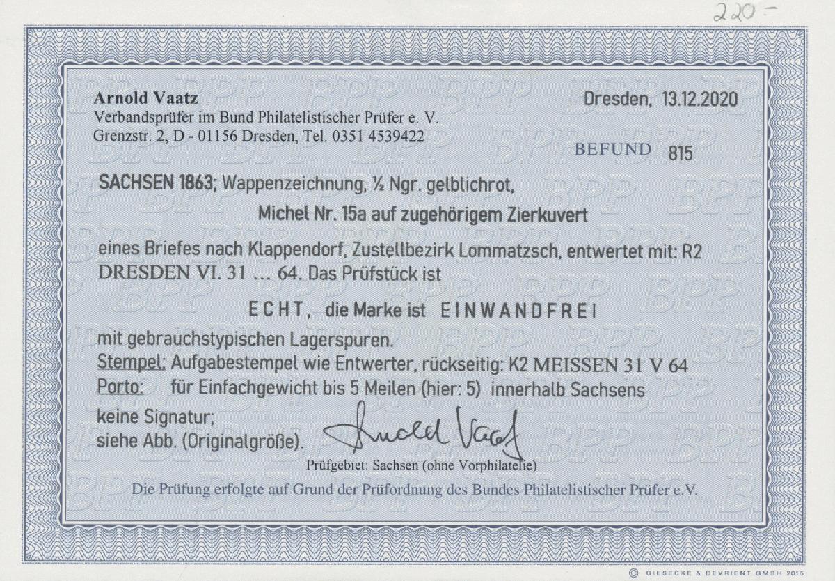 | Zusatzinformationen und Suchstichworte: | Christoph Gärtner 56. Auktion 12. - 16. Juni 2023 Los 4597 D Altdeutschland Sachsen 1864, Wappenzeichnung 1/2 Ngr gelblichrot auf dekorativem Zierbrief nach Klappendorf, entwertet mit R2 "DRESDEN VI. 31...64" sowie nebengesetztem Aufgabestempel. Rs. mit K2 "MEISSEN 31.5.64". Befund Vaatz, BPP(2020): "echt und einwandfrei mit gebrauchstypischen Lagerspuren." Zuschlag 230,00 EUR |