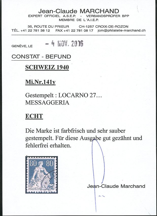 | Prüfer: | Marchand, Jean-Claude (SBPV / ASEP (Schweizerischer Briefmarken-Prüfer-Verband)) |