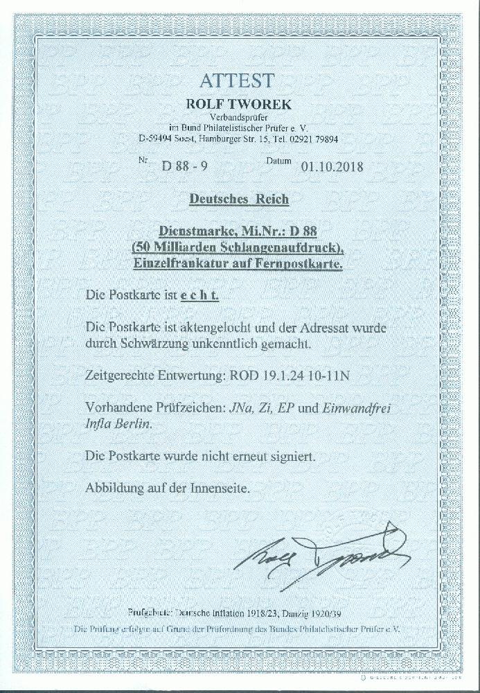 | Zusatzinformationen und Suchstichworte: | Dienstmarke Mi.Nr. D 88 (50 Milliarden Schlangendruck), Einzelfrankatur auf Fernpostkarte https://www.inflaseiten.de/belege/zeigen/13458 |