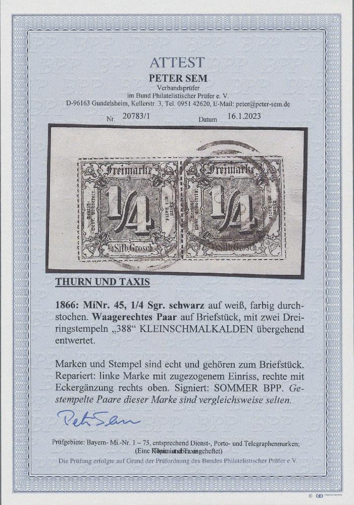 | Zusatzinformationen und Suchstichworte: | Christoph Gärtner 56. Auktion 12. - 16. Juni 2023 Los 4614 D Altdeutschland Thurn und Taxis 1866, ¼ Sgr. schwarz auf weiß, farbig durchstochen, farbfrisches waagerechtes Paar (kl. unauffällige Ausbesserungen) auf Briefstück, klar und sauber entwertet mit zwei NS "388" (Kleinschmalkalden), signiert und Attest Sommer BPP (1979) sowie aktuelles Attest Sem BPP. Mi. 5.000,- €. Eine seltene Einheit diese per se seltenen Marke! Ausruf 400,00 EUR |