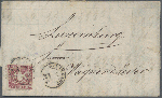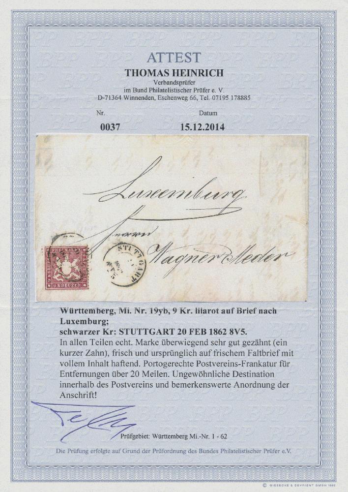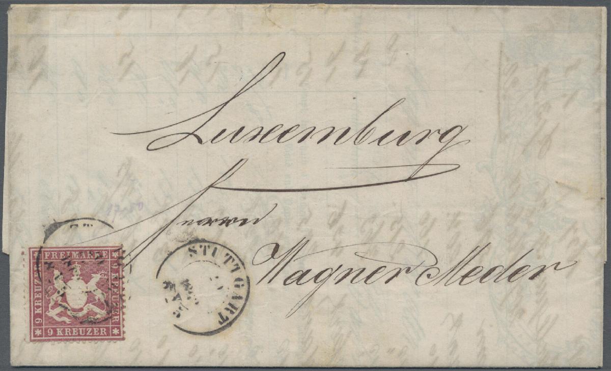 | Zusatzinformationen und Suchstichworte: | Christoph Gärtner 56. Auktion 12. - 16. Juni 2023 Los 4685 D Altdeutschland Württemberg 1861, 9 Kr lilarot, überwiegend sehr gut gezähnt (ein kurzer Zahn), frisch und ursprünglich auf Faltbrief mit vollem Inhalt von Stuttgart nach Luxemburg. Portorichtige Postvereins-Frankatur für Entfernungen über 20 Meilen. Eine ungewöhnliche Destination innerhalb des Postvereins. Rückseitig Bahnpoststempel BINGERBRÜCK/TRIER Ausruf 500,00 EUR |
