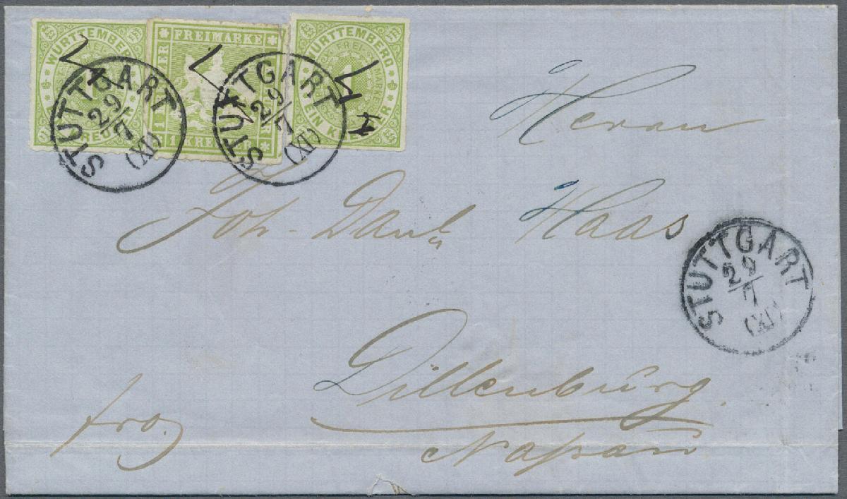 | Zusatzinformationen und Suchstichworte: | Christoph Gärtner 56. Auktion 12. - 16. Juni 2023 Los 4692 D Altdeutschland Württemberg 1869: 1 Kr. gelbgrün, 7. Ausgabe, mit guter Wappenprägung, zwischen 2 Exemplaren der Ziffernzeichnung 1 Kr. gelbgrün, 8. Ausgabe, sehr klar und übergehend entwertet mit Einkreisstempel «STUTTGART 29 7 (XI)» von 1869 und zusätzlichem Federzug, auf Brief nach Dillenburg verwendet. Die Marken weisen teils Unebenheiten auf, die in Anbetracht der Seltenheit dieser Frankaturkombination von untergeordneter Bedeutung sind. Lt. Fotoattest Irtenkauf/BPP "Ein schöner Brief, mit wert- und farbgleicher Mischfrankatur zwischen der 7. und 8. Ausgabe, IN DIESER KOMBINATION ÄUSSERST SELTEN." Zuschlag 1.500,00 EUR |