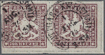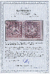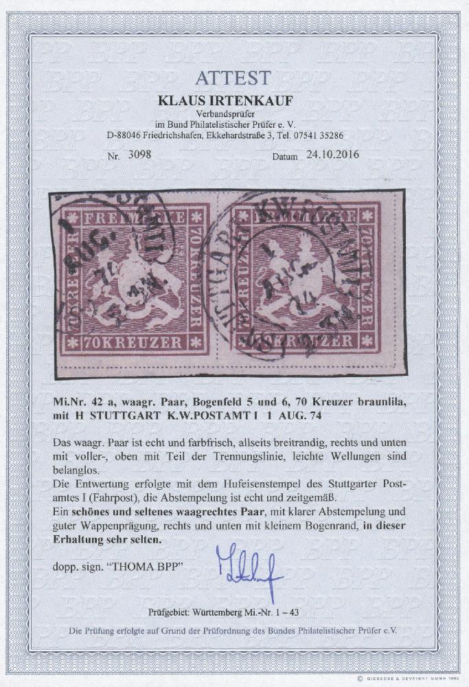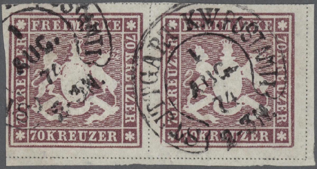 | Zusatzinformationen und Suchstichworte: | Christoph Gärtner 56. Auktion 12. - 16. Juni 2023 Los 4700 D Altdeutschland Württemberg 70 Kreuzer braunlila, waagerechtes Paar, Bogenfeld 5 und 6, mit Hufeisenstpl. STUTTGART K.W. POSTAMT 1 1 AUG. 74, das waagerechte Paar ist echt und farbfrisch, allseits breitrandig, rechts und unten mit voller-, oben mit Teil der Trennungslinie, leichte ursprüngliche Wellungen sind belanglos. Die Entwertung erfolgte mit dem Hufeisenstempel des Stuttgarter Postamtes 1 (Fahrpost), die Abstempelung ist echt und zeitgemäß. Ein schönes und seltenes waagerechtes Paar, mit klarer Abstempelung und guter Wappenprägung, rechts unten mit kleinem Bogenrand, in dieser Erhaltung sehr selten! Doppelt signiert "THOMA BPP" Ausruf 8.000,00 EUR |