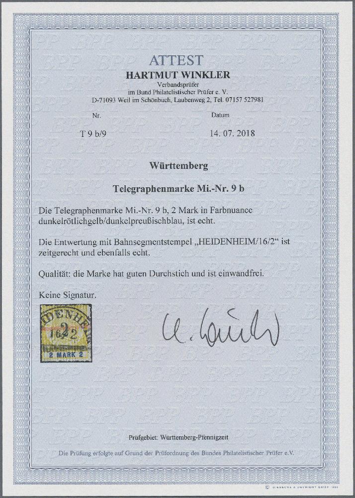 | Prüfgebiet: | Altdeutschland Württemberg Telegraphenmarken |