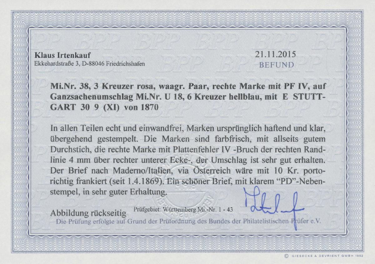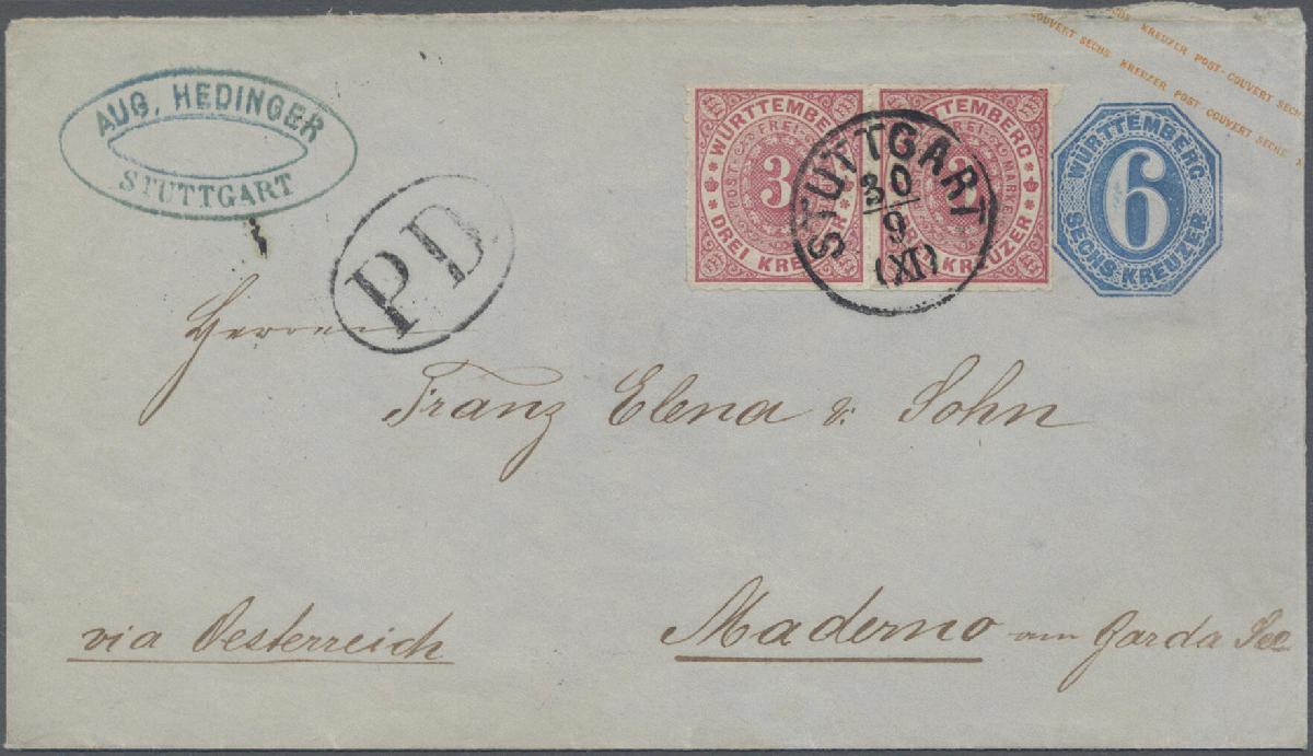 | Zusatzinformationen und Suchstichworte: | Christoph Gärtner 56. Auktion 12. - 16. Juni 2023 Los 4719 D Altdeutschland Württemberg 1869, 3 Kr rosa, waagerechtes Paar, rechte Marke mit Plattenfehler IV übergehend entwertet "STUTTGART 30/9 (XI)" auf 6 Kr hellblau Ganzsachenumschlag, handschriftlich "via Österreich" nach Maderno am Gardasee (Italien). Klarer PD Stempel vorderseitig, rückseitig Transitstempel von Verona und Brescia sowie ein Ankunftstempel vom 3 Oktober. Leicht überfrankierter Bedarfsbrief - das seit 1.4.1869 geltende Porto wären 10 Kr gewesen Zuschlag 250,00 EUR |