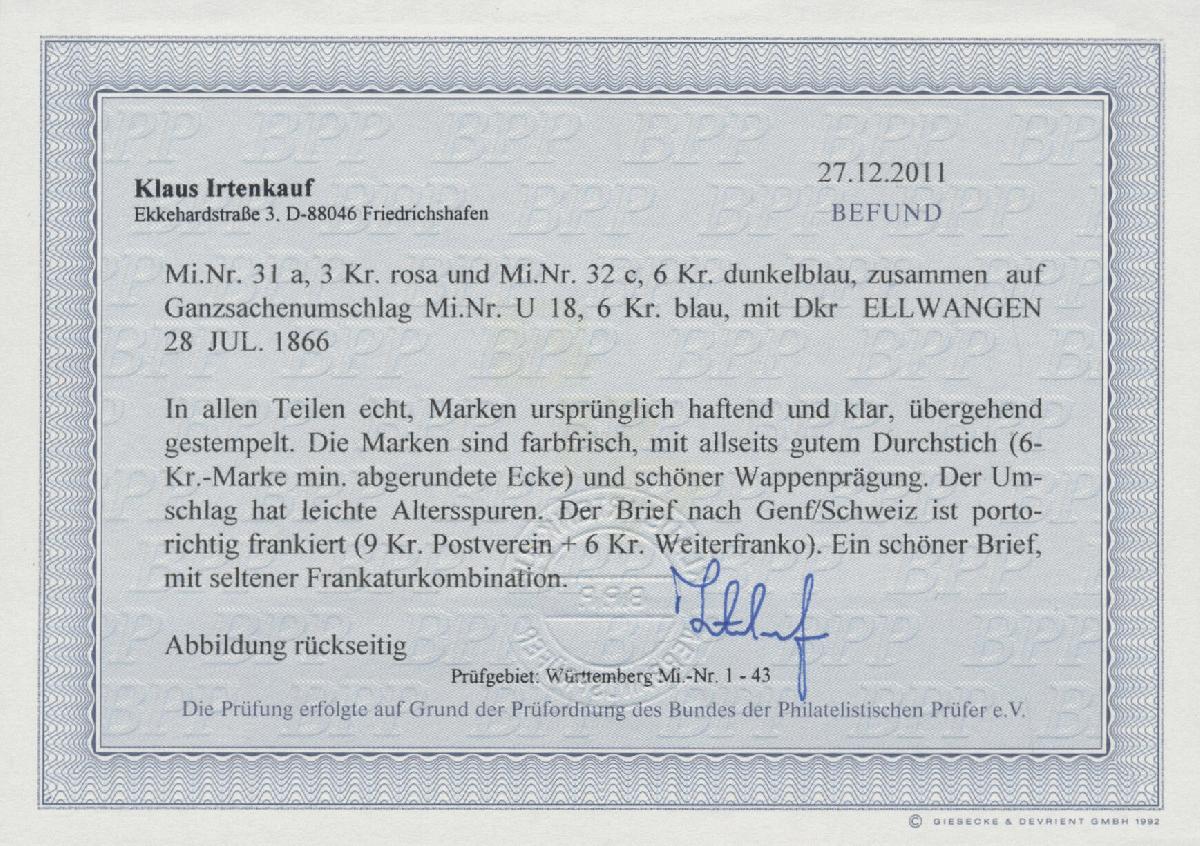 | Zusatzinformationen und Suchstichworte: | Christoph Gärtner 56. Auktion 12. - 16. Juni 2023 Los 4720 D Altdeutschland Württemberg 1865, 3 Kr rose und 6 Kr dunkelblau auf Ganzsachenumschlag 6 Kr blau, übergehend entwertet mit Doppelkreis "ELLWANGEN 28 JUL 1866" nach Genf. Rückseitig Transit und Ankunftstempel. Portorichtig (9 Kr Postverein und 6 Kr Weiterfranko). Der Umschlag mit deutlichem Abklatsch des Wertstempels. Eine seltene Frankaturkombination. Zuschlag 420,00 EUR |