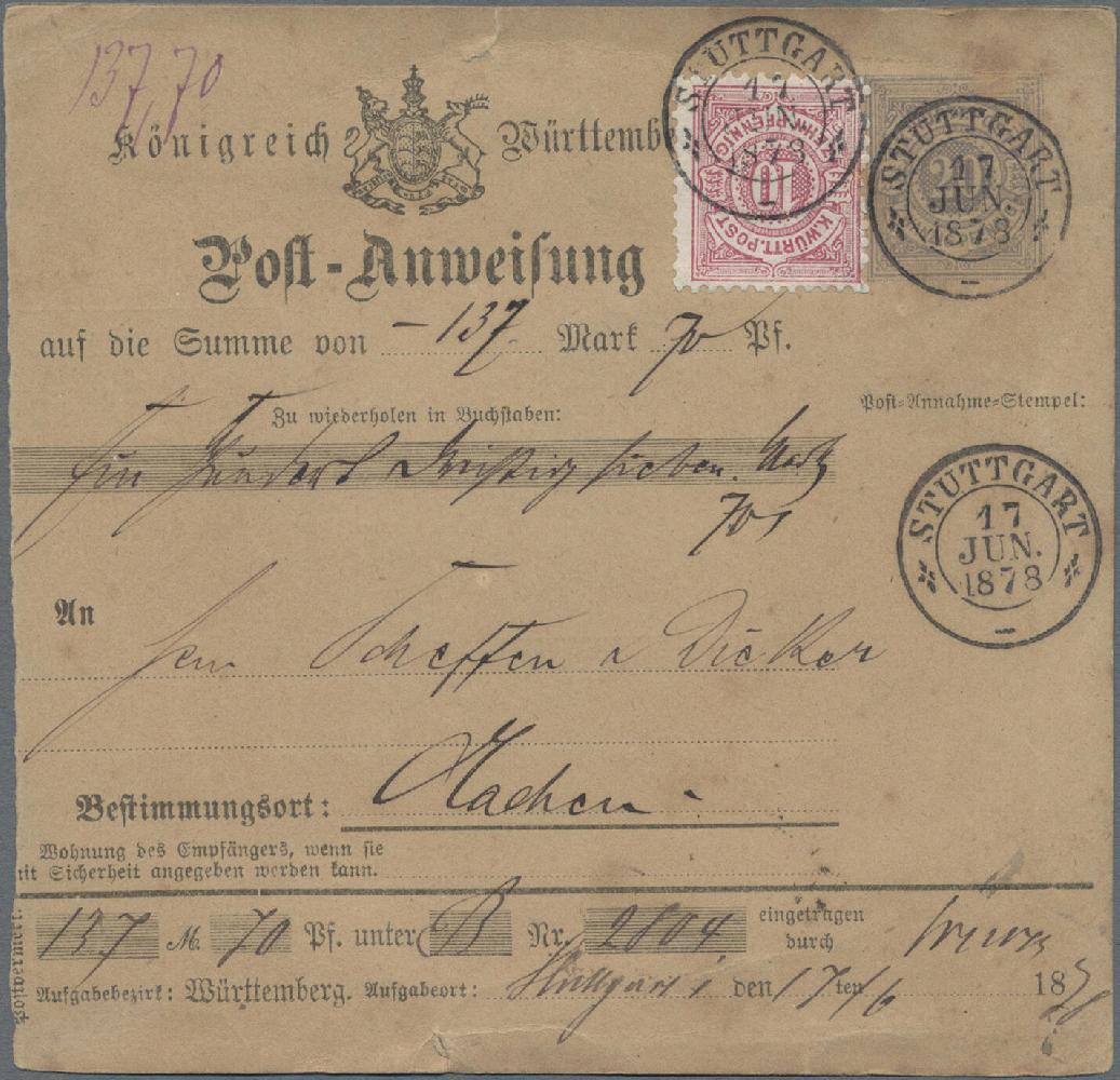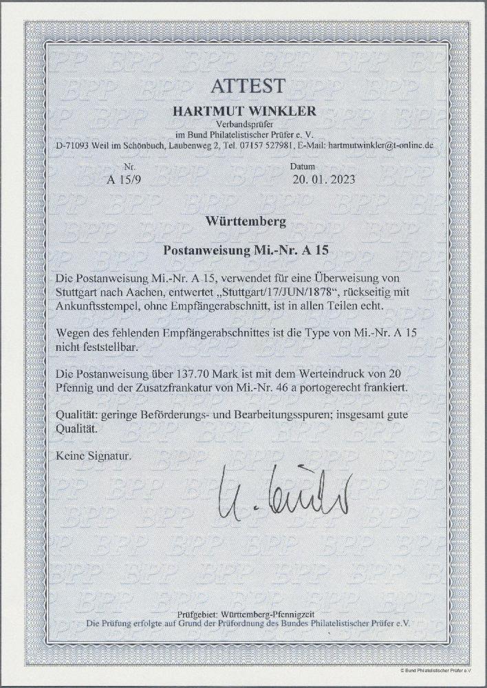 | Zusatzinformationen und Suchstichworte: | Christoph Gärtner 56. Auktion 12. - 16. Juni 2023 Los 4731 D Altdeutschland Württemberg 1878, Post-Anweisung 20 Pfg (ohne Empfängerabschnitt) zufrankiert mit 10 Pfg. über einen Betrag von 137,70 Mark portogerecht von Stuttgart nach Aachen, geringe Beförderungs- und Bearbeitungsspuren; insgesamt gute Qualität Ausruf 150,00 EUR |