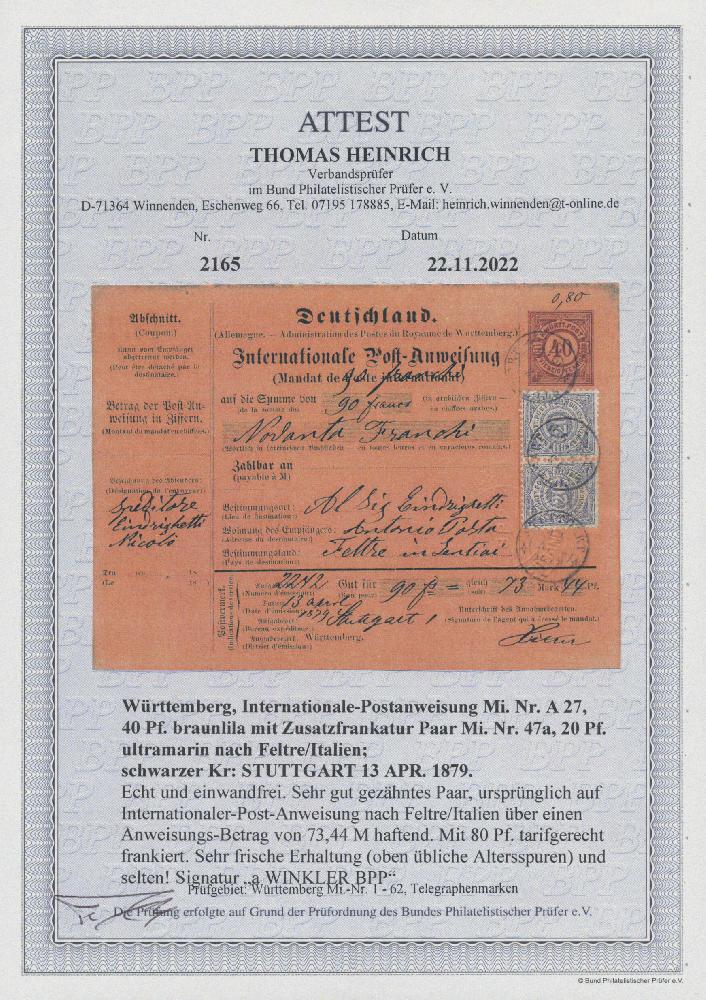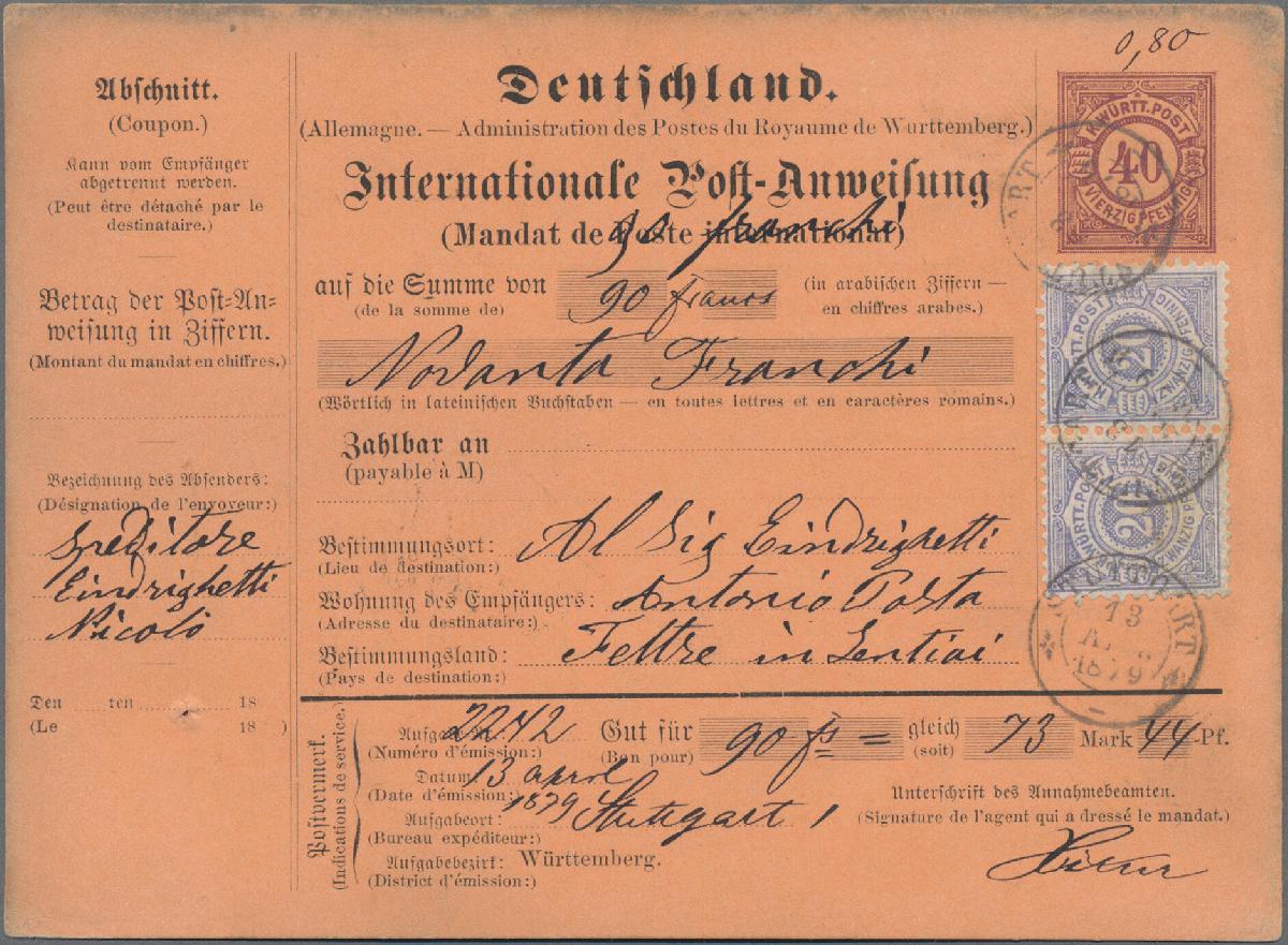 | Zusatzinformationen und Suchstichworte: | Christoph Gärtner 56. Auktion 12. - 16. Juni 2023 Los 4735 D Altdeutschland Württemberg 1879, Postanweisung 40 Pfg. braunlila mit Zusatzfrankatur waagerechtes Paar 20 Pfg. ultramarin, tarifgerechte 80 Pfg.-Frankatur für eine Postanweisung über 90 Francs (=73.44 Mark) von "STUTTGART 13 APR 1879" nach Feltre/Italien mit rs. Ankunftsstempel 28.4. sowie Auszahlungs-/Bearbeitungsvermerk, oben mit leichten Spuren (belanglos), gesamt in sehr sauberer und frischer Erhaltung. Signiert Winkler BPP sowie Fotoattest Heinrich BPP. Es sind nicht viele komplette Postanweisungen erhalten geblieben. Zuschlag 180,00 EUR |