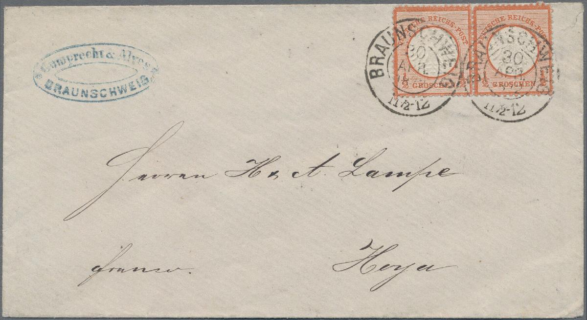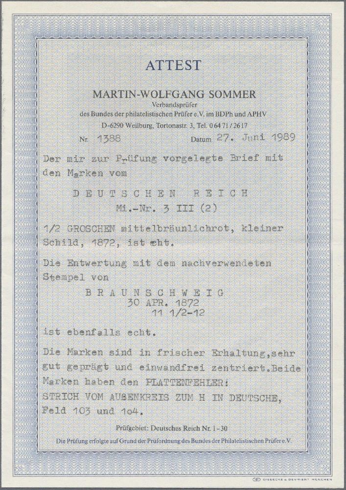 | Zusatzinformationen und Suchstichworte: | Christoph Gärtner 56. Auktion 12. - 16. Juni 2023 Los 4801 D Deutsches Reich, 1872 Kleiner Brustschild 1872, Kleiner Schild ½ Gr. mittelbräunlichrot, zwei farbfrische Exemplare im waagerechten Doppelstück in guter Prägung und Zentrierung als tarifgerechte Mehrfachfrankatur auf Brief von "BRAUNSCHWEIG 30 APR. 72" nach Hoya mit rs. Ausgabestempel vom selben Tag. Als Besonderheit weisen beide Werte(!) den Plattenfehler III auf(lt. Michel-Handbuch-Katalog): "Farbstrich vom Außenkreis zum H in DEUTSCHE"(Feld 103/104). Mit Attest Sommer, BPP(1989). Es existieren nur wenige Briefe von Paaren mit diesem PF. Zuschlag 135,00 EUR |