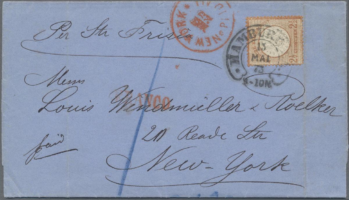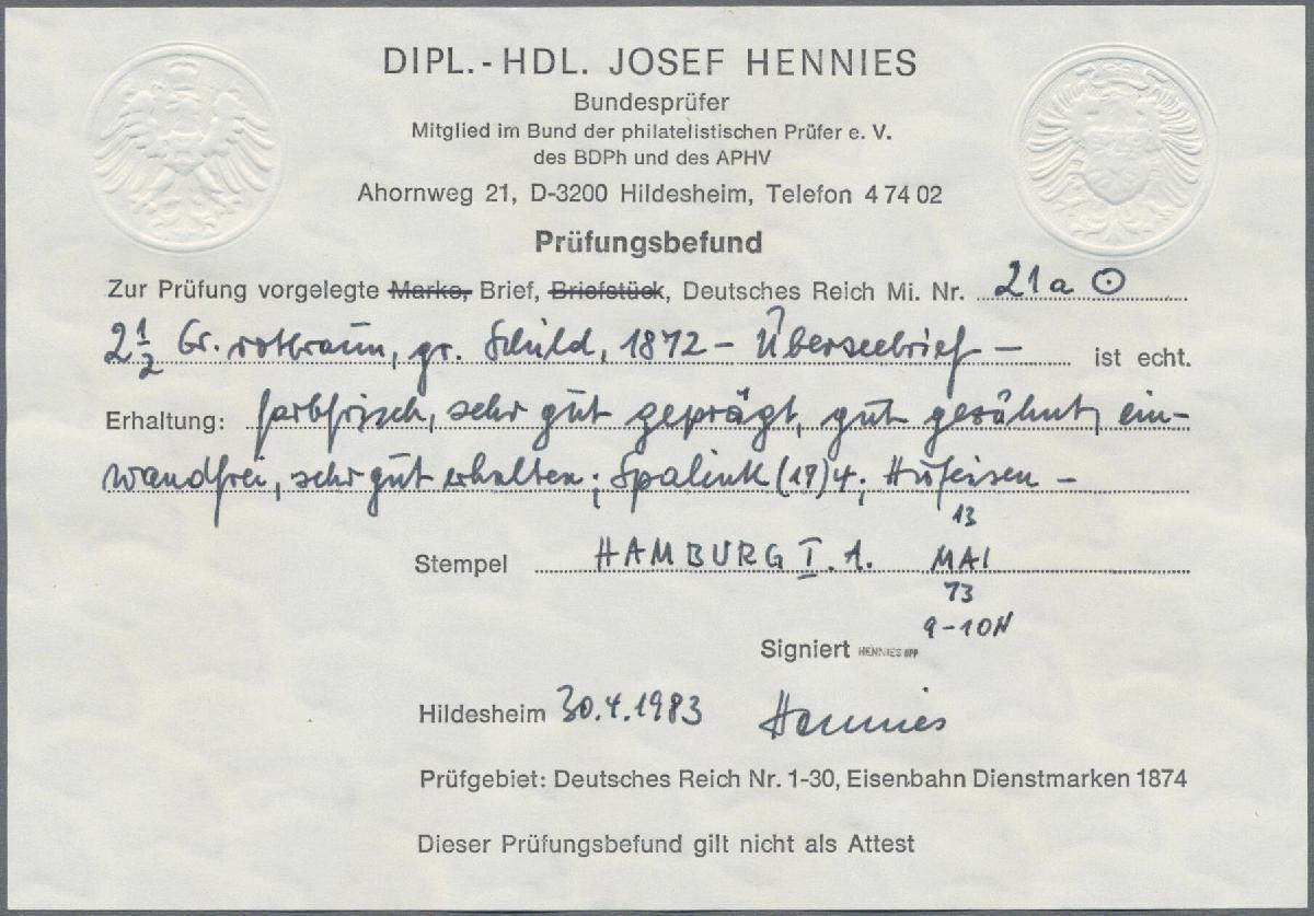 | Zusatzinformationen und Suchstichworte: | Christoph Gärtner 56. Auktion 12. - 16. Juni 2023 Los 4809 D Deutsches Reich 1872, 2 1/2 Gr großer Schild auf tarifgerechtem Franco-Überseebrief, sauber entwertet mit Hufeisenstempel(Spalink 17-4) "HAMBURG I.A. 13 MAI 73", gelaufen nach New York, vs. mit Ank.-Stempel. Die Marke ist farbfrisch, sehr gut geprägt und einwandfrei erhalten. Foto-Befund Hennies, BPP(1983). Ausruf 80,00 EUR |