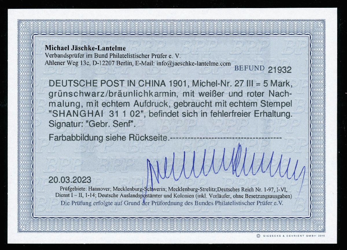 | Prüfgebiet: | Deutsche Auslandspostämter China |