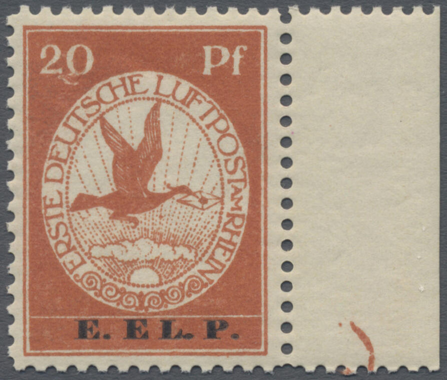 | Zusatzinformationen und Suchstichworte: | Christoph Gärtner 56. Auktion 12. - 16. Juni 2023 Los 4862 D Deutsches Reich 1912, Flugpost Rhein/Main, 20 Pf. mit Aufdruck "E.EL.P ", postfrisches Randstück mit Aufnadelmarkierung, laut KB C.Brettl echt und einwandfrei, Mi. 450.- Ausruf 100,00 EUR |