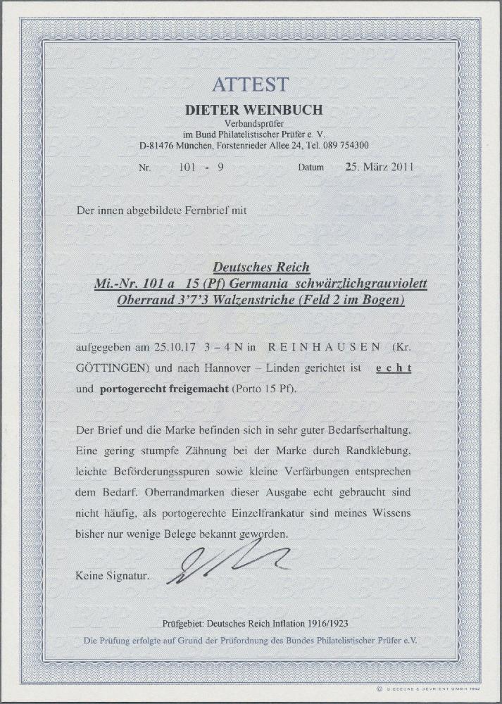 | Prüfer: | Weinbuch, Dieter (BPP (Bund Philatelistischer Prüfer)) |