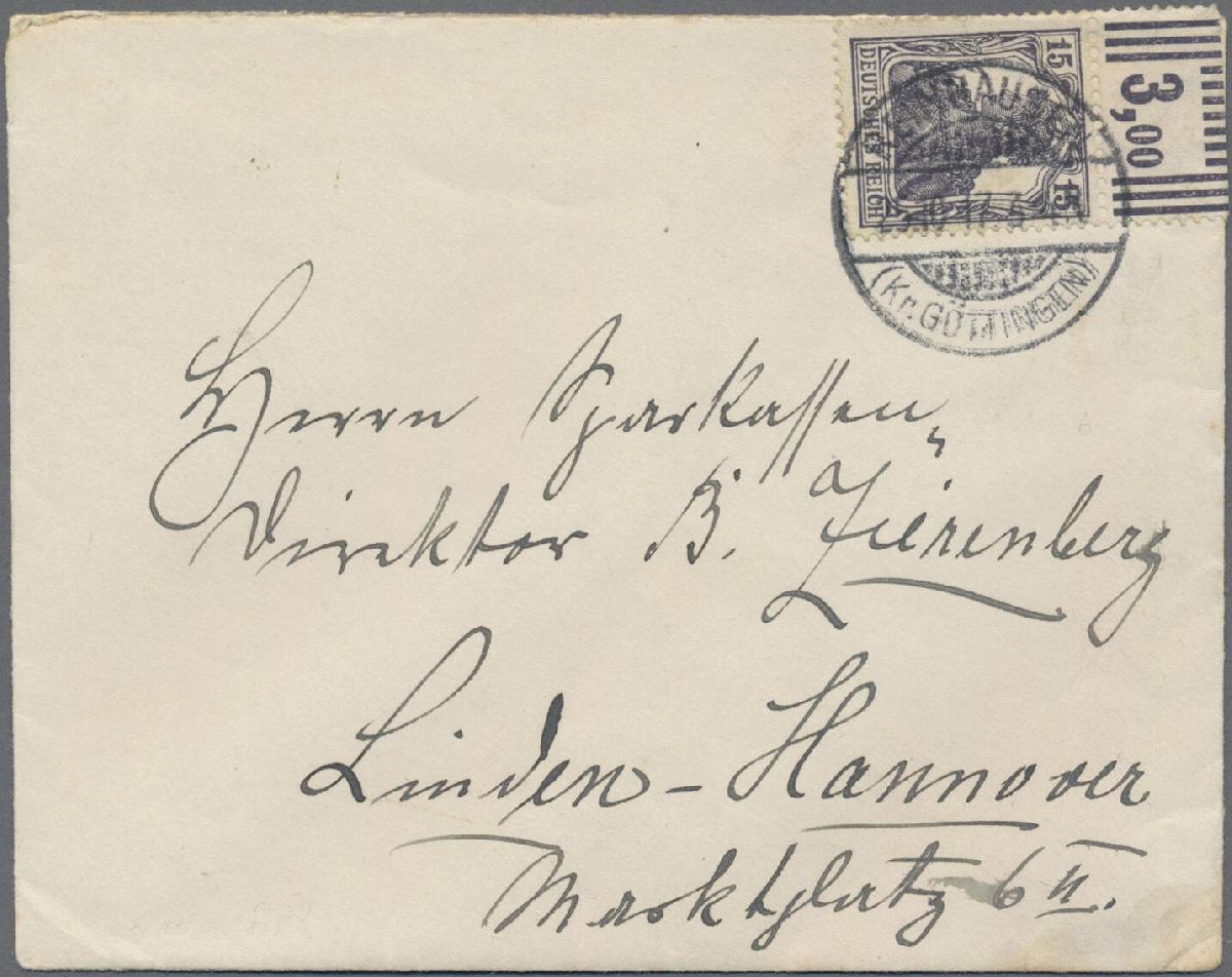 | Zusatzinformationen und Suchstichworte: | Christoph Gärtner 56. Auktion 12. - 16. Juni 2023 Los 4869 D Deutsches Reich, Germania mit WZ 1917, 15 Pf schwärzlichgrauviolett Germania, Oberrandstück im Walzendruck, als portogerechte Einzelfrankatur auf Brief von Reinhausen(Kr.Göttingen), 25.10.17, nach Hannover-Linden. Brief und Marke in sehr guter Bedarfserhaltung. Oberrandmarken dieser Ausgabe als portogerechte Einzelfrankaturen sind nur in wenigen Exemplaren bekannt Ausruf 280,00 EUR |