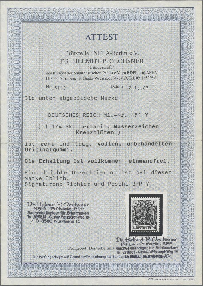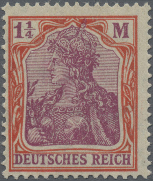| Zusatzinformationen und Suchstichworte: | Christoph Gärtner 56. Auktion 12. - 16. Juni 2023 Los 4873 D Deutsches Reich, Germania mit WZ 1920, 1 1/4 M. orangerot, mit Wasserzeichenabart (Vierpaß-WZ), in einwandfreier postfrischer Erhaltung, gepr. Peschl BPP, signiert Richter und Altattest Dr. Oechsner BPP "einwandfrei". Mi. 1.200,- € Ausruf 300,00 EUR |