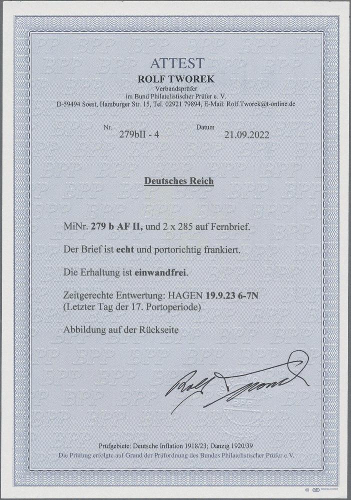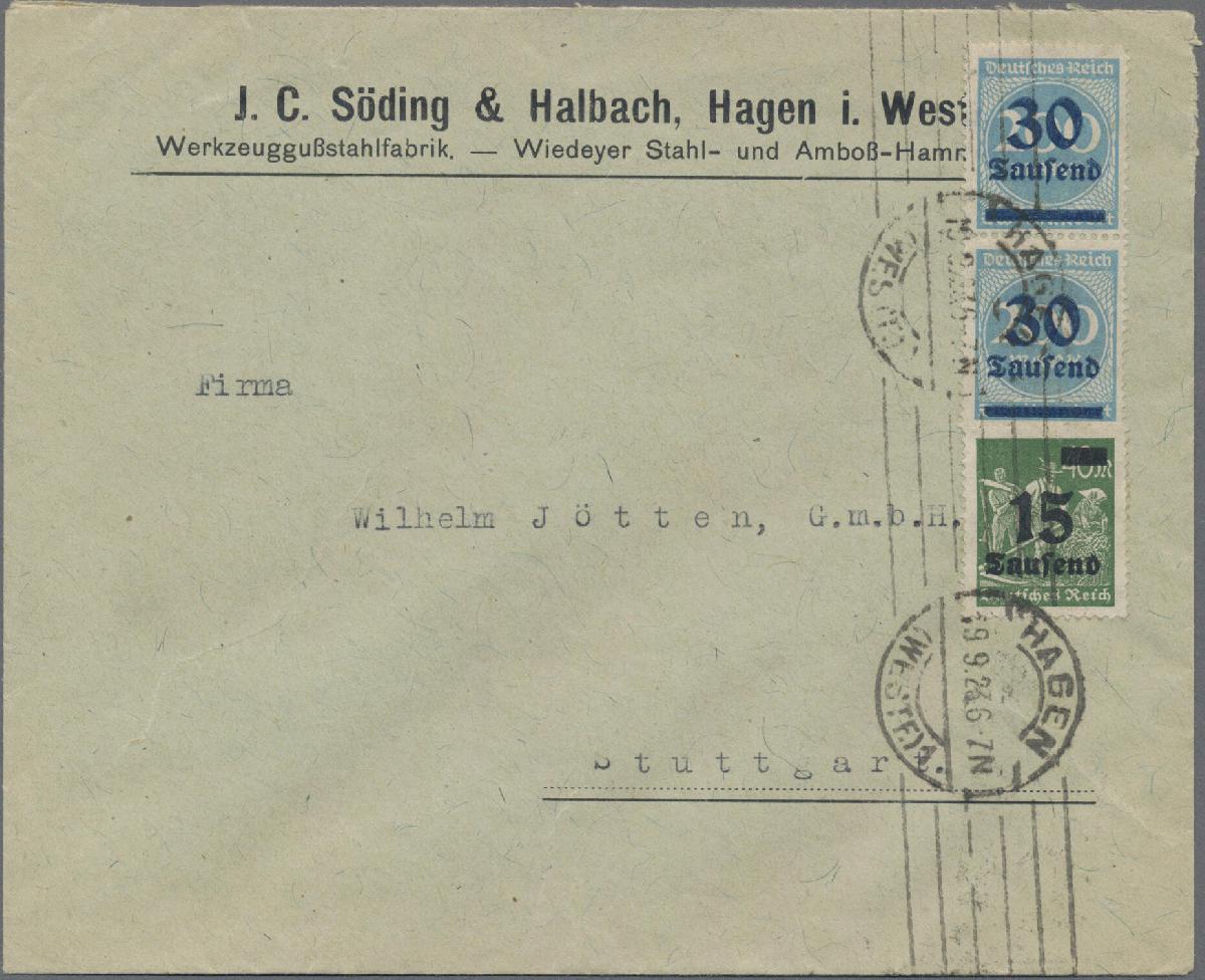 | Zusatzinformationen und Suchstichworte: | Christoph Gärtner 56. Auktion 12. - 16. Juni 2023 Los 4891 D Deutsches Reich, 1918/23 Inflationsausgaben 1923, 15 Tsd. auf 40 M. schwarzgrün mit PLATTENFEHLER "d von Tausend oben abgebrochen" und zweimal 30 Tsd. auf 200 M. auf portorichtig frankiertem Fernbrief, zeitgerecht entwertet am Letzttag der 17. Portoperiode "HAGEN 19.9.23 6-7 N" nach Stuttgart, 2echt und einwandfrei" Ausruf 500,00 EUR |