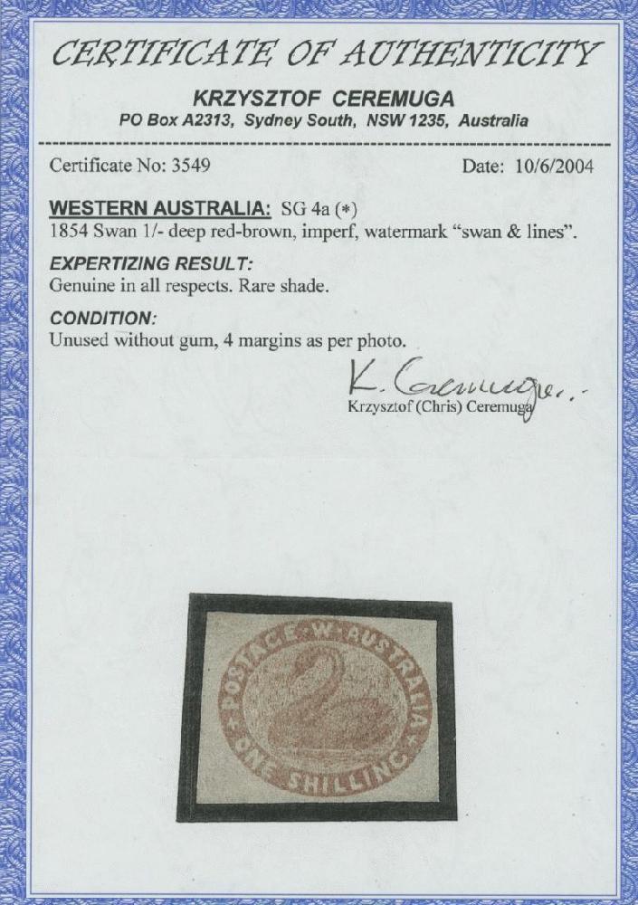 | Zusatzinformationen und Suchstichworte: | 248. Abacus Auktion Auktionstermin: 20. - 22. Juli 2022 Los 748 Westaustralien 1854-55 Lithographien ungezähnt 1/- tief rotbraun SG 4a Randstück vom linken Bogenrand mit senkrechtes Wasserzeichen Linien auf der linken Seite, gerandet dicht bei groß, ungebraucht, Katalogwert £2000. Chris Ceremuga Attest (2004) Bundesländer "seltener Farbton" Ausruf 750,00 AUD |