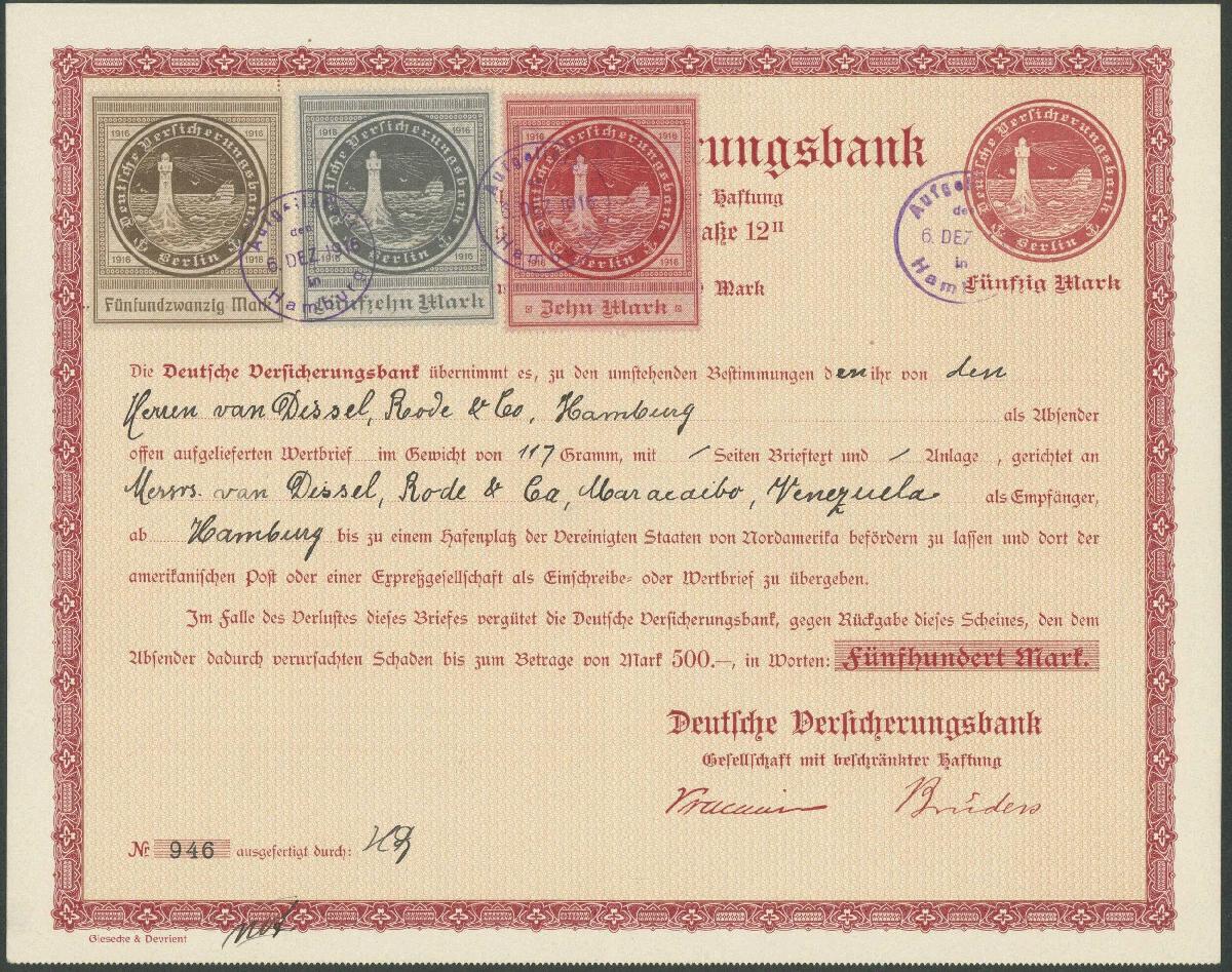 | Zusatzinformationen und Suchstichworte: | Ulrich Felzmann 178. Auktion 22. Juni 2023 Los 3007 Deutsche Kolonien Schiffspost Ozeanreederei 10 Mk karminrot mit erstmals bei dieser Wertstufe bekannter Wasserzeichen-Variante "fallende Wellenlinien", sensationelles Stück neben 15 und 25 Mk mit normalem Wasserzeichen, äußerst attraktiv in Reihe geklebt in tarifrichtiger Beifrankatur für einen 117 g schweren Wertbrief auf 50 Mk Wertkarte, Nr. 946 mit Druckvermerk und sauberen Stempeln "Aufgeliefert in HAMBURG den 6. DEZ. 1916", gerichtet an die Firma "Dissel, Rode & Co." in Maracaibo, Venezuela, Stammhaus der in Hamburg 1893 gegründeten Firma gleichen Namens. Die Karte weist lediglich die vorherige, der Übergröße geschuldete Mittelfaltung auf, welche die großartige Frankatur in keiner Weise beeinträchtigt, entsprechend gewürdigt im ausführlichen Fotoattest Wagner BPP "Die Erhaltung ist einwandfrei. Die Destination Venezuela ist sehr selten und nur in wenigen Exemplaren belegt" - In Kombination mit der erstmals in dieser Form angebotenen Wasserzeichen-Variante einmaliges Spitzenstück in exquisiter Qualität! Ausruf 25.000,00 EUR |