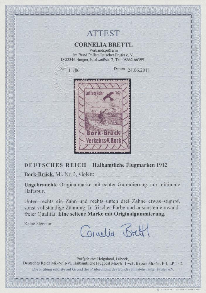 | Prüfer: | Brettl, Cornelia (BPP (Bund Philatelistischer Prüfer)) |