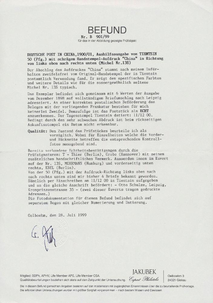 | Zusatzinformationen und Suchstichworte: | Christoph Gärtner 56. Auktion 12. - 16. Juni 2023 Los 5125 D Deutsche Auslandspost China 1900, 50 Pfg. dunkelbräunlichlila/rotschwarz auf mattbraunorange mit Handstempelaufdruck "China" von LINKS OBEN NACH RECHTS UNTEN, farbfrisch und einwandfrei mit Entwertung «TIENTSIN 11/12 00» in Mischfrankatur mit den Mi.-Nrn. 1 II b, 2 II, 3 II c, und 4 II auf überfrankiertem R-Brief nach Leipzig, der den Postweg ordnungsgemäß durchlaufen hat. Der Umschlag ist zweiseitig geöffnet mit drei senkrechten Bügen und einigen Schürfstellen, vorderseitig signiert Ebel, Thier und Jakubek, rückseitig signiert Grobe. Der prägnante Brief präsentiert den SELTENEN SCHRÄGAUFDRUCK in dekorativer Fünffarbenfrankatur Ausruf 20.000,00 EUR |