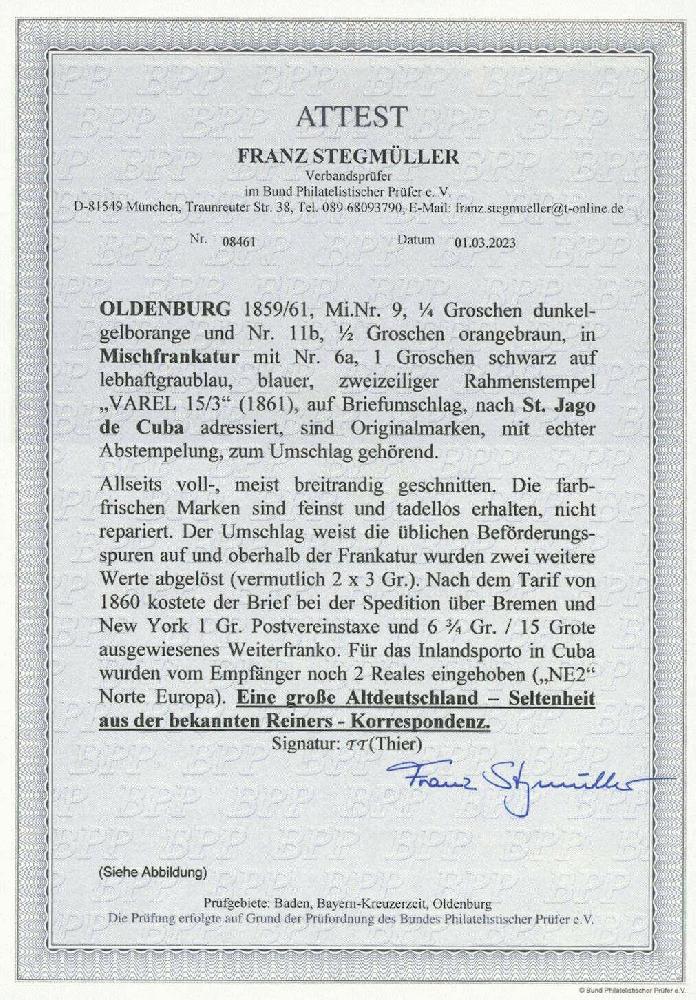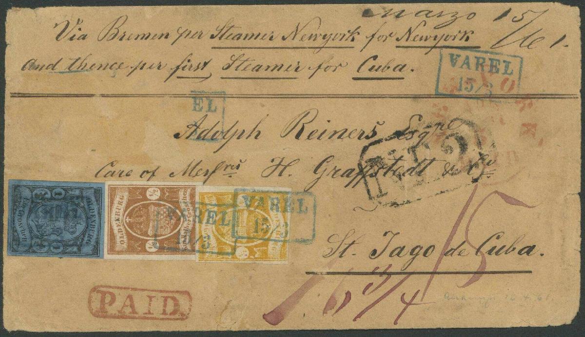 | Zusatzinformationen und Suchstichworte: | Ulrich Felzmann 178. Auktion 22. Juni 2023 Los 2578 Altdeutschland Oldenburg ¼ Gr dunkelgelborange sowie ½ Gr orangebraun in Mischfrankatur mit 1 Gr auf lebhaftgraublau, äußerst wirkungsvolle, in Reihe geklebte Dreifarbenfrankatur auf altersgerecht erhaltenem Transatlantik-Kuvert VAREL 15/3 (1861) nach St. Jago de Cuba! Die tarifgemäß erforderliche Beifrankatur zweier weiterer Werte fehlt leider, alle drei vorhandenen Werte beider Ausgaben befinden sich in fehlerfreier Erhaltung, herrlich farbfrisch und ringsum tadellos voll- bis breitrandig sowie sauber und klar entwertet, hierunter die äußerst selten auf Brief anzutreffende, insbesondere der Darstellung entsprechend "krummer" Auslandsporti dienende ¼ Gr orange, hier ausgeworfen 1 Gr Postvereinstaxe und 6¾ Gr/15 Grote Weiterfranko bei detailliert angegebenem Leitweg "Via Bremen per Steamer Newyork for Newyork and thence per first Steamer for Cuba", entsprechend vs. Transit NEW YORK in rot sowie "NE2" für 2 Reales Inlandsporto, die vom Empfänger erhoben wurden, rs. Transite Bremen 16.3. sowie Habana 10.4.61. Zweifach attestiert Brettl/Schmitt sowie Stegmüller BPP "Eine große Altdeutschland-Seltenheit aus der bekannten Reiners-Korrespondenz" Ausruf 15.000,00 EUR |