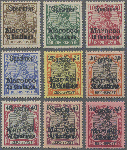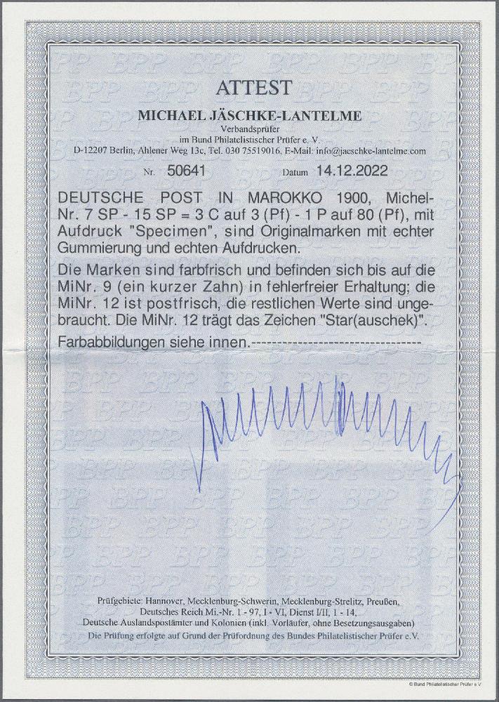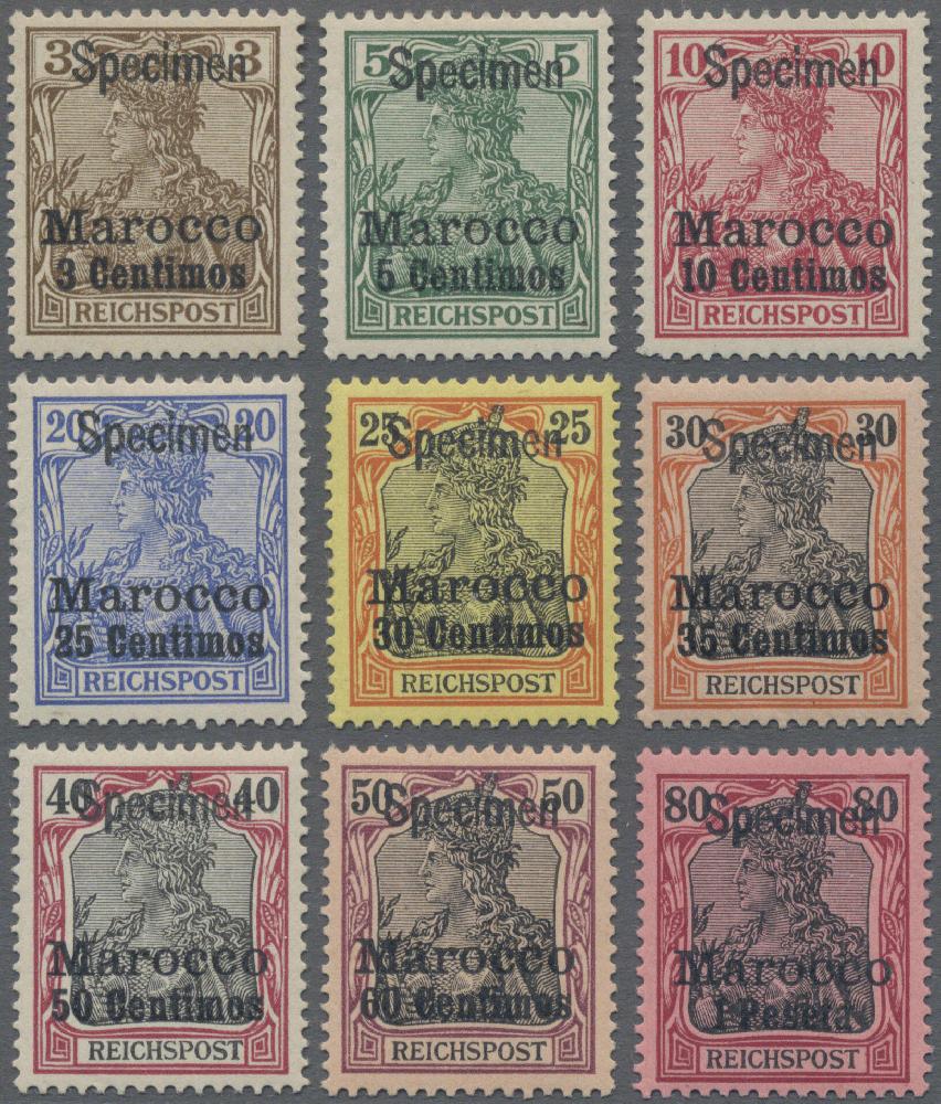 | Zusatzinformationen und Suchstichworte: | Christoph Gärtner 56. Auktion 12. - 16. Juni 2023 Los 5149 D Deutsche Auslandspost Marokko 1900, 3 c bis 1 P auf 3 - 80 Pfg Germania Reichspost, je mit Aufdruck "Specimen", alle 9 Wert sauber ungebraucht, die 10 c mit einem kurzen Zahn, die 35 c sogar postfrisch Ausruf 350,00 EUR |