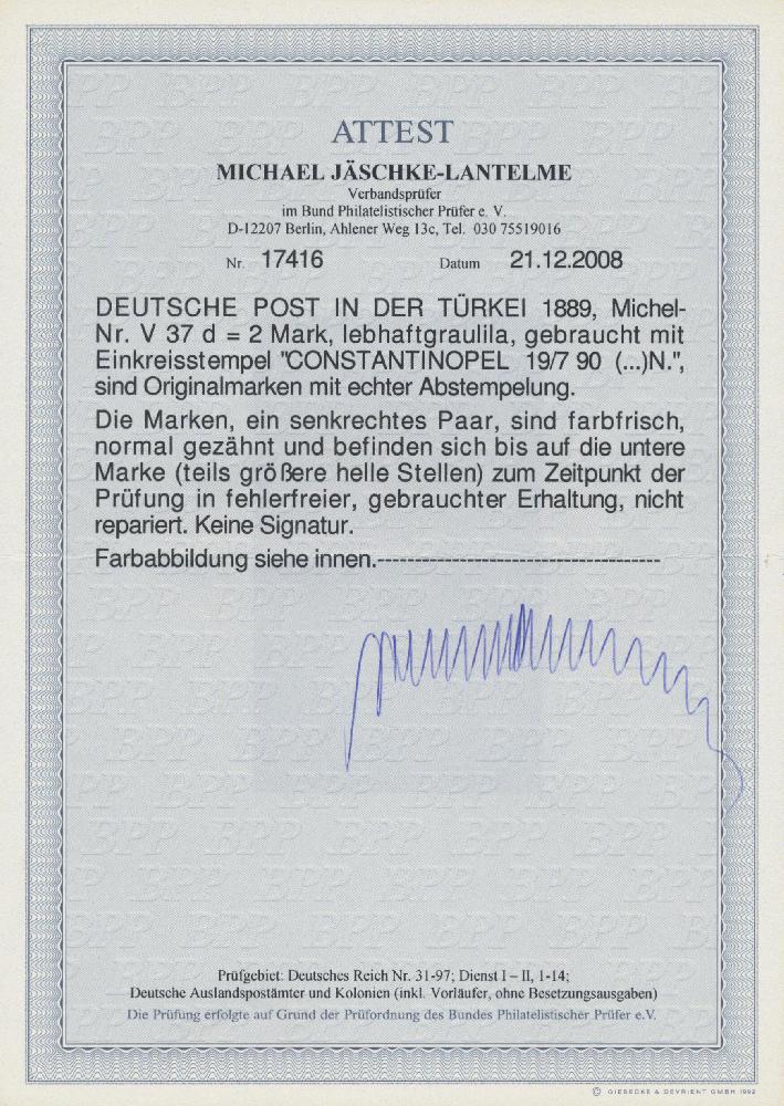 | Prüfer: | Jäschke-Lantelme, Michael (BPP (Bund Philatelistischer Prüfer)) |