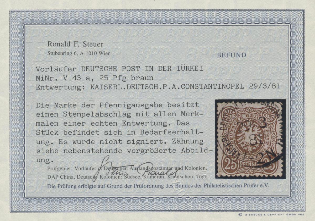 | Zusatzinformationen und Suchstichworte: | Christoph Gärtner 56. Auktion 12. - 16. Juni 2023 Los 5182 D Deutsche Auslandspost Türkei, Vorläufer PFENNIG, 25 Pfg., Stempel CONSTANTINOPEL 29/3/81, Prachtstück, Foto-Befund Ronald F. Steuer, Mi 350,- Zuschlag 120,00 EUR |