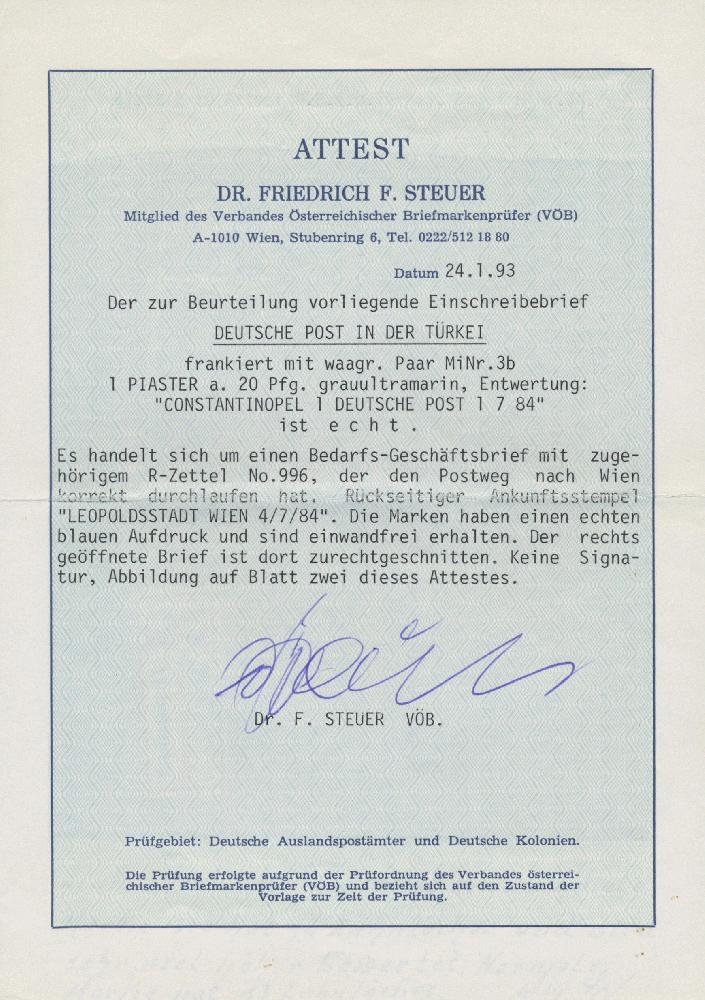 | Zusatzinformationen und Suchstichworte: | Christoph Gärtner 56. Auktion 12. - 16. Juni 2023 Los 5186 D Deutsche Auslandspost Türkei 1884, Überdruck-Ausgabe, 1 P. auf 20 Pfg. mittel- bis lebhaftviolettultramarin, waagerechtes Paar, die linke Marke in seltener CE Breite, tadellos auf portogerechtem Geschäftsvordruckbrief mit zugehörigem R-Zettel von Constantinopel nach Wien, rechts ist der Umschlag etwas verkürzt, seltener Beleg, Foto-Attest Dr. Steuer (1993) sowie Ronald F. Steuer (2010), ein recht seltener Beleg Ausruf 250,00 EUR |