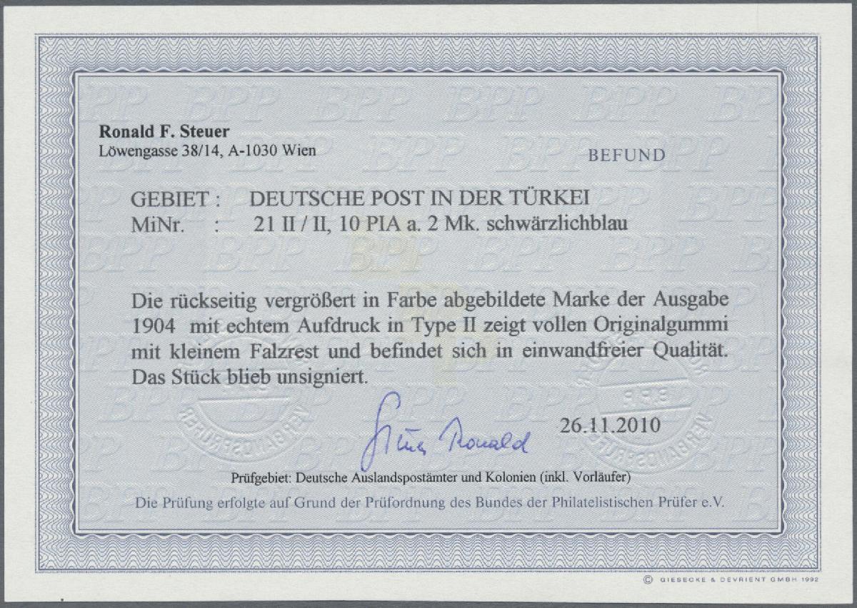 | Zusatzinformationen und Suchstichworte: | Christoph Gärtner 56. Auktion 12. - 16. Juni 2023 Los 5200 D Deutsche Auslandspost Türkei 1900, Reichspost, 10 P. auf 2 Mk., Type II, ungebraucht mit kleinem Falzrest, Foto-Befund (als rechtes Randstück) Ronald F. Steuer BPP, Mi 450,- Zuschlag 108,00 EUR |