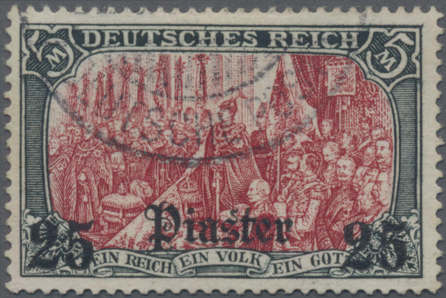| Zusatzinformationen und Suchstichworte: | Christoph Gärtner 56. Auktion 12. - 16. Juni 2023 Los 5205 D+ Deutsche Auslandspost Türkei 1905, 25 Pia. auf 5 Mark grünschwarz/dunkelkarmin, bessere Farbe (Aufdruck auf Urmarke 81 A b), sauber entwertet mit Teilabschlag von Constantinopel Zuschlag 900,00 EUR |