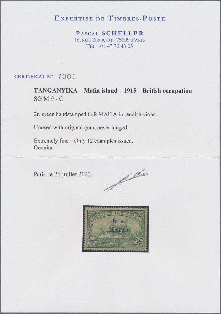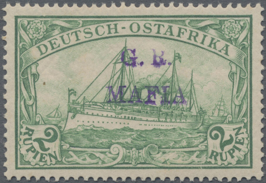 | Zusatzinformationen und Suchstichworte: | Christoph Gärtner 56. Auktion 12. - 16. Juni 2023 Los 5243 D Deutsche Kolonien Ostafrika Brit. Besetzung 1915: Deutsch-Ostafrika 2 R. grün mit Handstempelaufdruck »G.R. MAFIA« in lila (rötlich-violett), postfrisch, eine äußerst seltene Marke, von der nur 12 Exemplare hergestellt worden sein sollen Zuschlag 10.000,00 EUR |