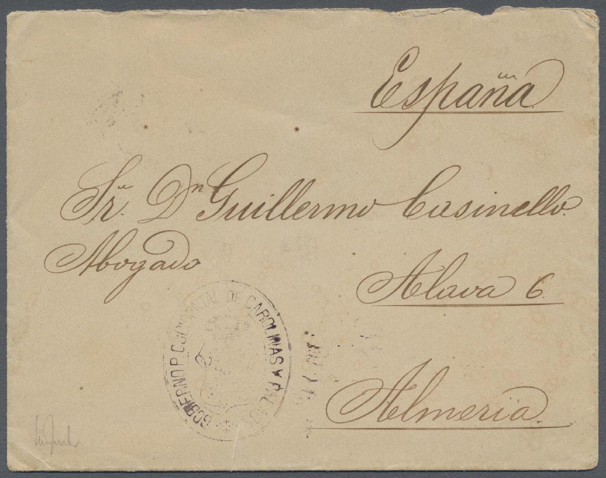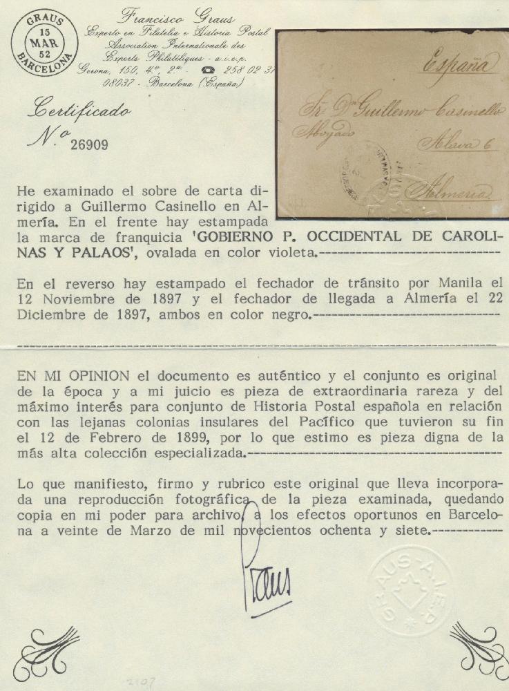 | Zusatzinformationen und Suchstichworte: | Christoph Gärtner 56. Auktion 12. - 16. Juni 2023 Los 5290 D Deutsche Kolonien Karolinen PALAU-Inseln: 1897, "GOBIERNO P.OCCIDENTAL DE CAROLINAS Y PALOS", Ovalstempel klar auf bar bezahlten Brief via "MANILA 12.NOV.97" nach Almeria mit Ankunftsstempel vom 22.12.97, Umschlag mit kleinem Einriss unten, sonst in guter Gesamterhaltung, sehr selten, von den Palau-Inseln gibt es aus dieser Zeit keine zehn Belege Ausruf 1.500,00 EUR |