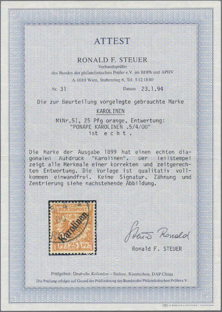 | Zusatzinformationen und Suchstichworte: | Christoph Gärtner 56. Auktion 12. - 16. Juni 2023 Los 5297 D Deutsche Kolonien Karolinen 1899, Diagonaler Aufdruck, 25 Pfg., sauberer Stempel PONAPE KAROLINEN 5/4/00, tadellos erhalten, Foto-Attest Ronald F. Steuer BPP (1994): "Der Teilstempel zeigt alle Merkmale einer korrekten und zeitgerechten Entwertung, echt und einwandfrei", Mi 3400,- Zuschlag 630,00 EUR |