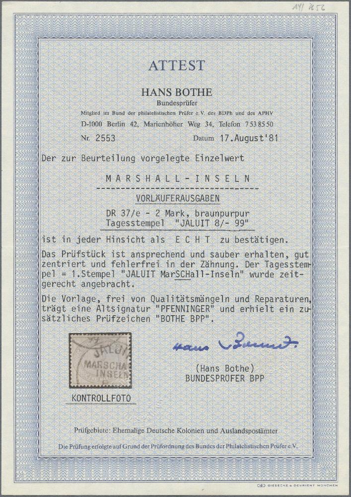 | Zusatzinformationen und Suchstichworte: | Christoph Gärtner 56. Auktion 12. - 16. Juni 2023 Los 5337 D Deutsche Kolonien Marshall Inseln, Vorläufer 1899, 2 Mk. dunkelrotkarmin, mit Stempel JALUIT, Prachtstück Zuschlag 250,00 EUR |