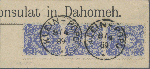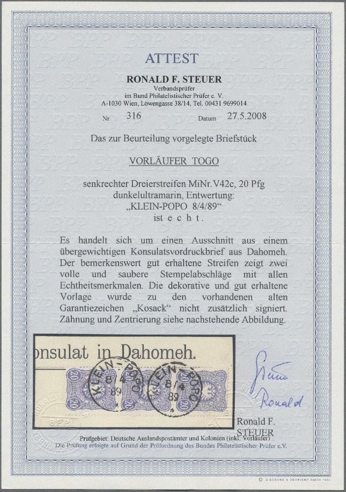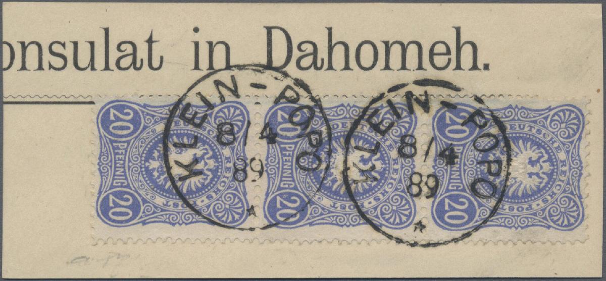 | Zusatzinformationen und Suchstichworte: | Christoph Gärtner 56. Auktion 12. - 16. Juni 2023 Los 5344 D Deutsche Kolonien Togo, Vorläufer Pfennig-Ausgabe, 20 Pfg., senkrechter Dreierstreifen auf großem Briefstück (Konsulatsvordruck aus Dahomeh), Stempel KLEIN-POPO 8/4/89, sign. Kosack. Ein besonders dekoratives Stück Zuschlag 200,00 EUR |