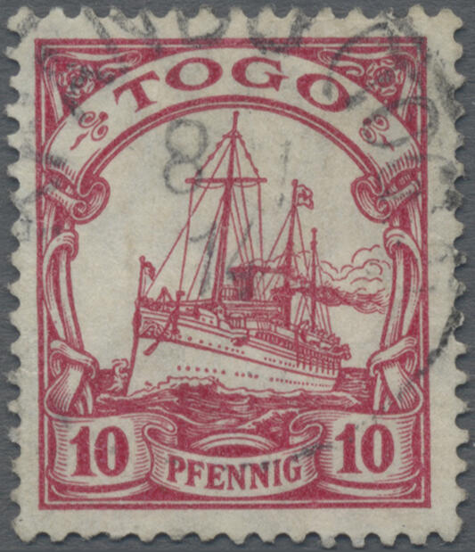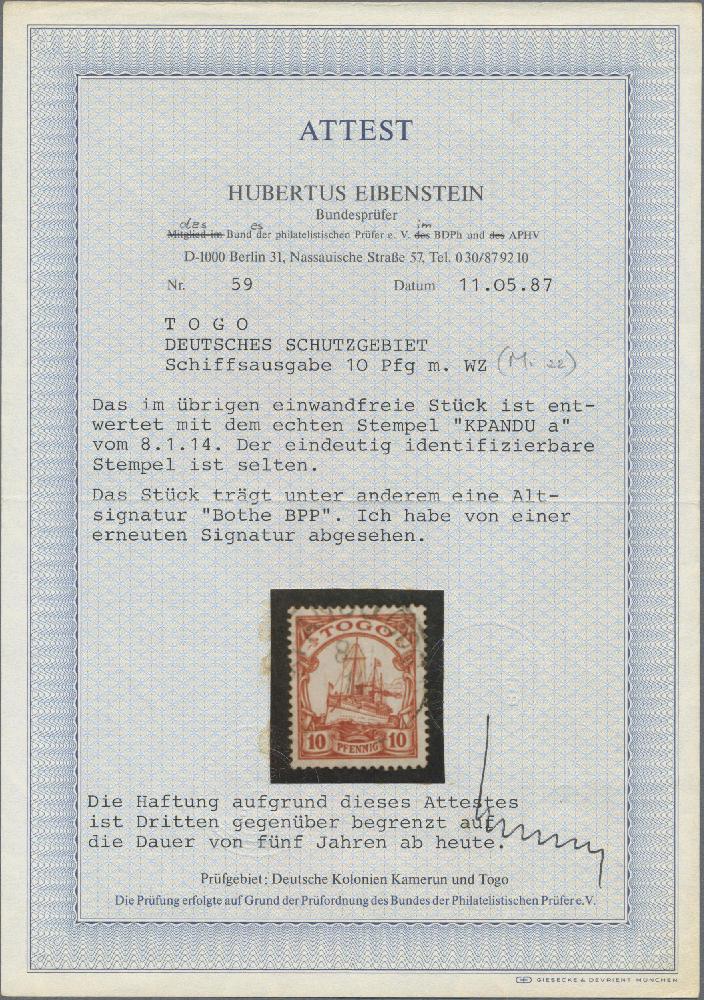 | Zusatzinformationen und Suchstichworte: | Christoph Gärtner 56. Auktion 12. - 16. Juni 2023 Los 5348 D Deutsche Kolonien Togo KPANDU a 8/1/14 auf Schiff mit Wz., 10 Pfg., sehr seltener Stempel, gepr. Pfenninger, Bothe BPP sowie Foto-Attest Eibenstein BPP (1987) Zuschlag 250,00 EUR |