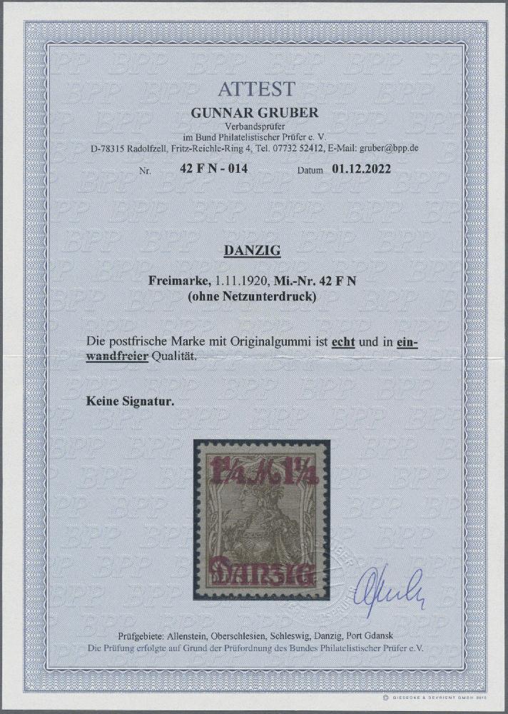 | Zusatzinformationen und Suchstichworte: | Christoph Gärtner 56. Auktion 12. - 16. Juni 2023 Los 5515 D Danzig 1920, 1¼ Mk auf 3 Pf Germania OHNE Netzunterdruck, tadellos postfrisch in unsignierter Luxuserhaltung Ausruf 300,00 EUR |