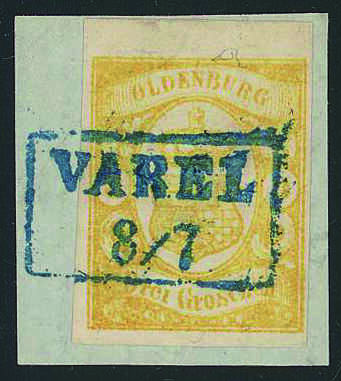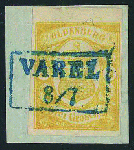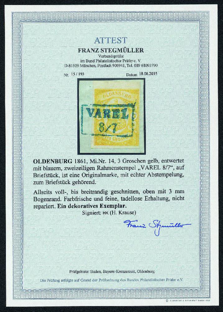 | Zusatzinformationen und Suchstichworte: | Gert Müller 119. Auktion 24. - 26. August 2023 Los 3878 Altdeutschland Oldenburg 3 Gr. zitronengelb, ein wundervoll farbfrisches, allseits perfekt gerandetes Luxusstück mit Oberrand auf bildschönem Briefstück mit klarem, gerade aufgesetztem blauem Rahmenstempel "VAREL 8/7". In dieser exzellenten Qualität so gut wie nie angeboten. Ein Ausnahmestück für allerhöchste Ansprüche! Fotoattest "TADELLOSE ERHALTUNG" Stegmüller BPP Ausruf 1.000,00 EUR |