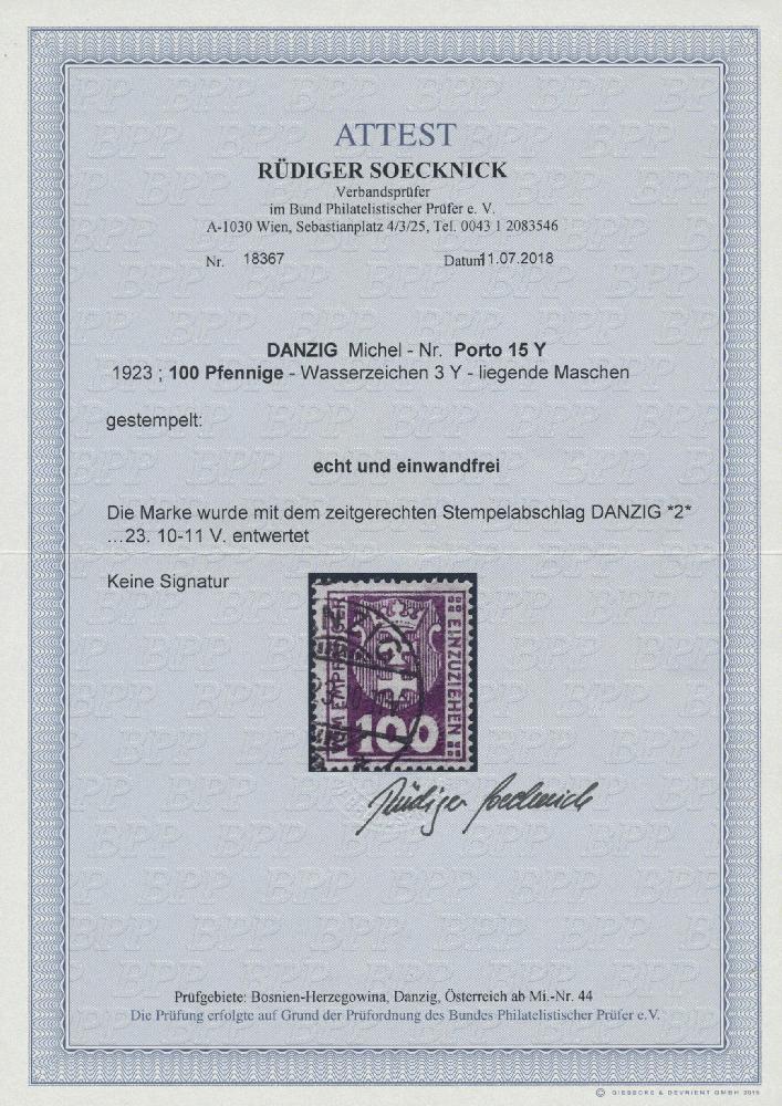 | Zusatzinformationen und Suchstichworte: | Christoph Gärtner 56. Auktion 12. - 16. Juni 2023 Los 5532 D Danzig 1923, 100 (Pf) dunkelviolettpurpur, Wasserzeichen Maschen liegend, zeitgerechter Stempelabschlag "DANZIG * 2 * ...23. 10-11 V.", "echt und einwandfrei", Fotoattest Soecknick BPP (Mi€900,-) Ausruf 200,00 EUR |